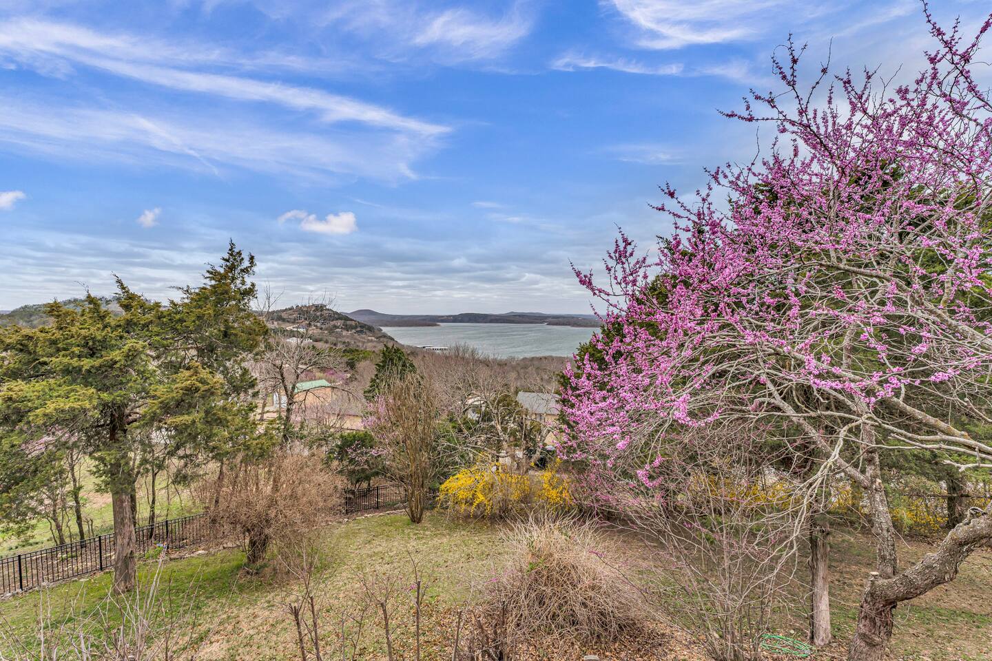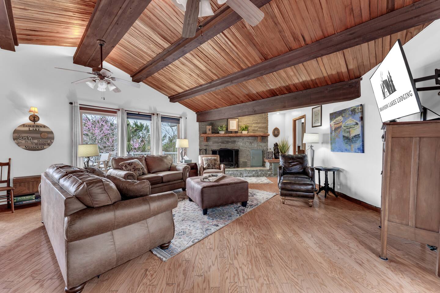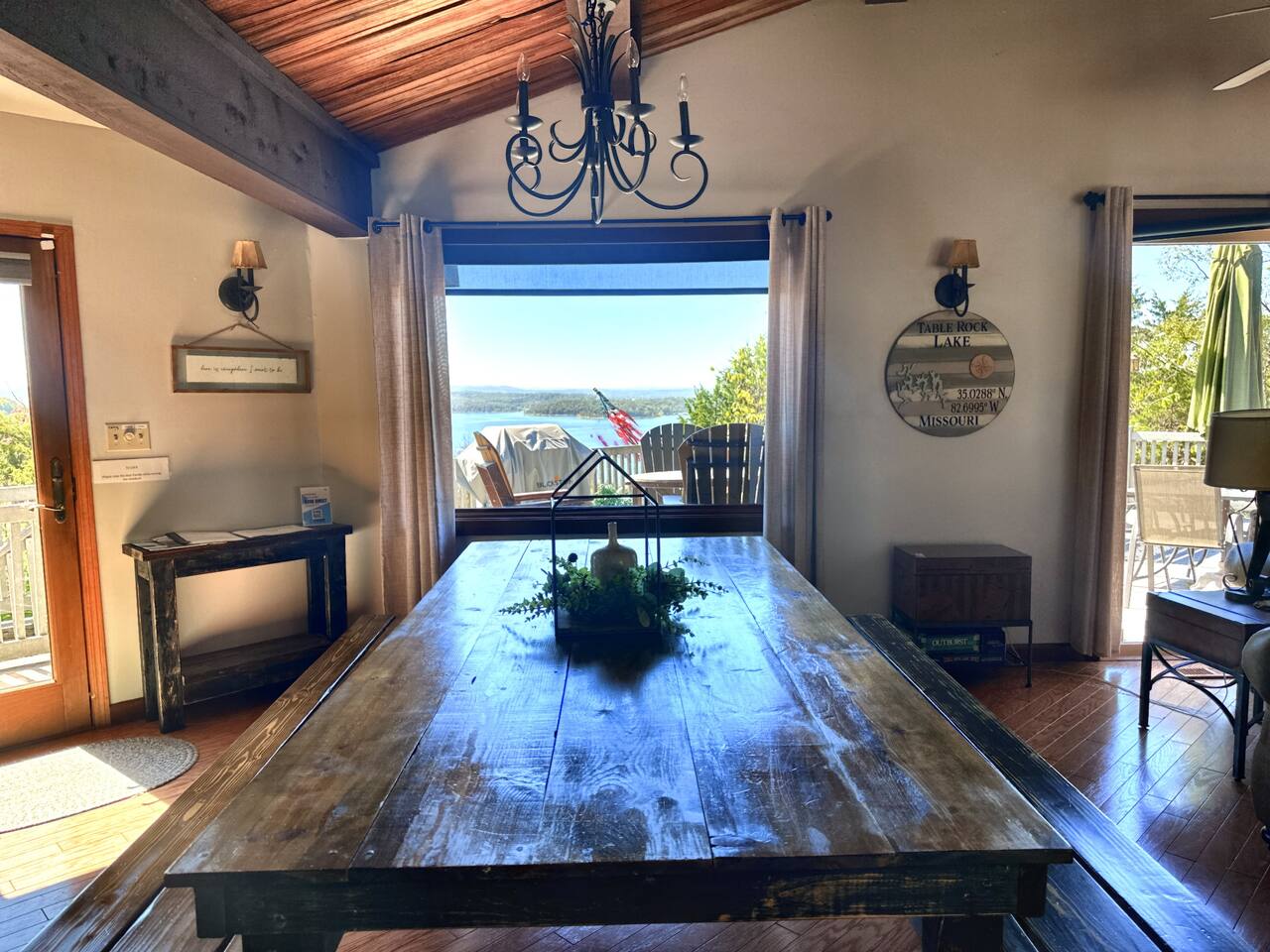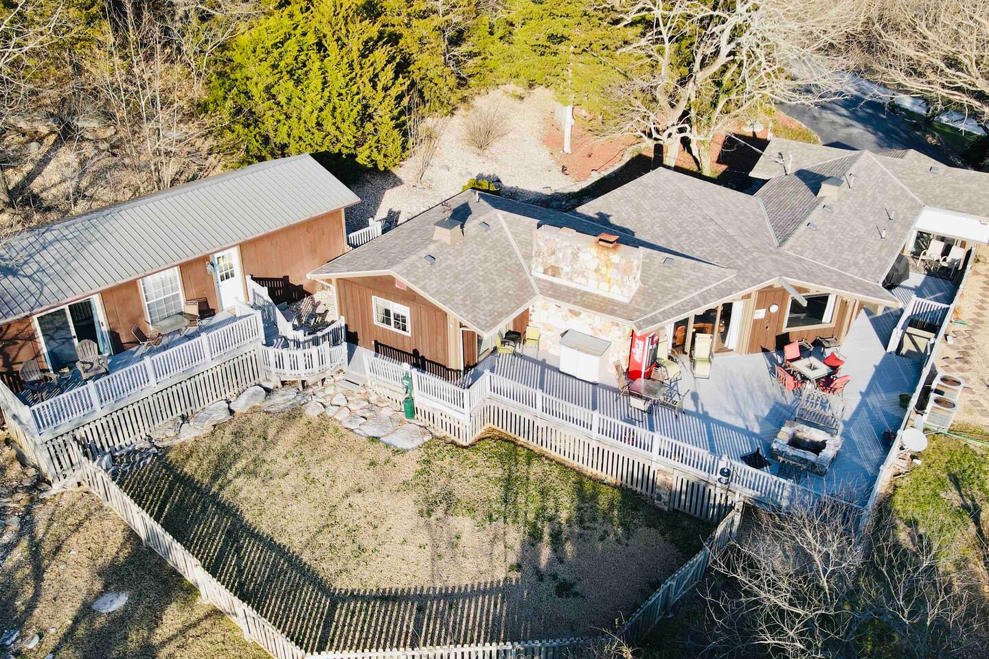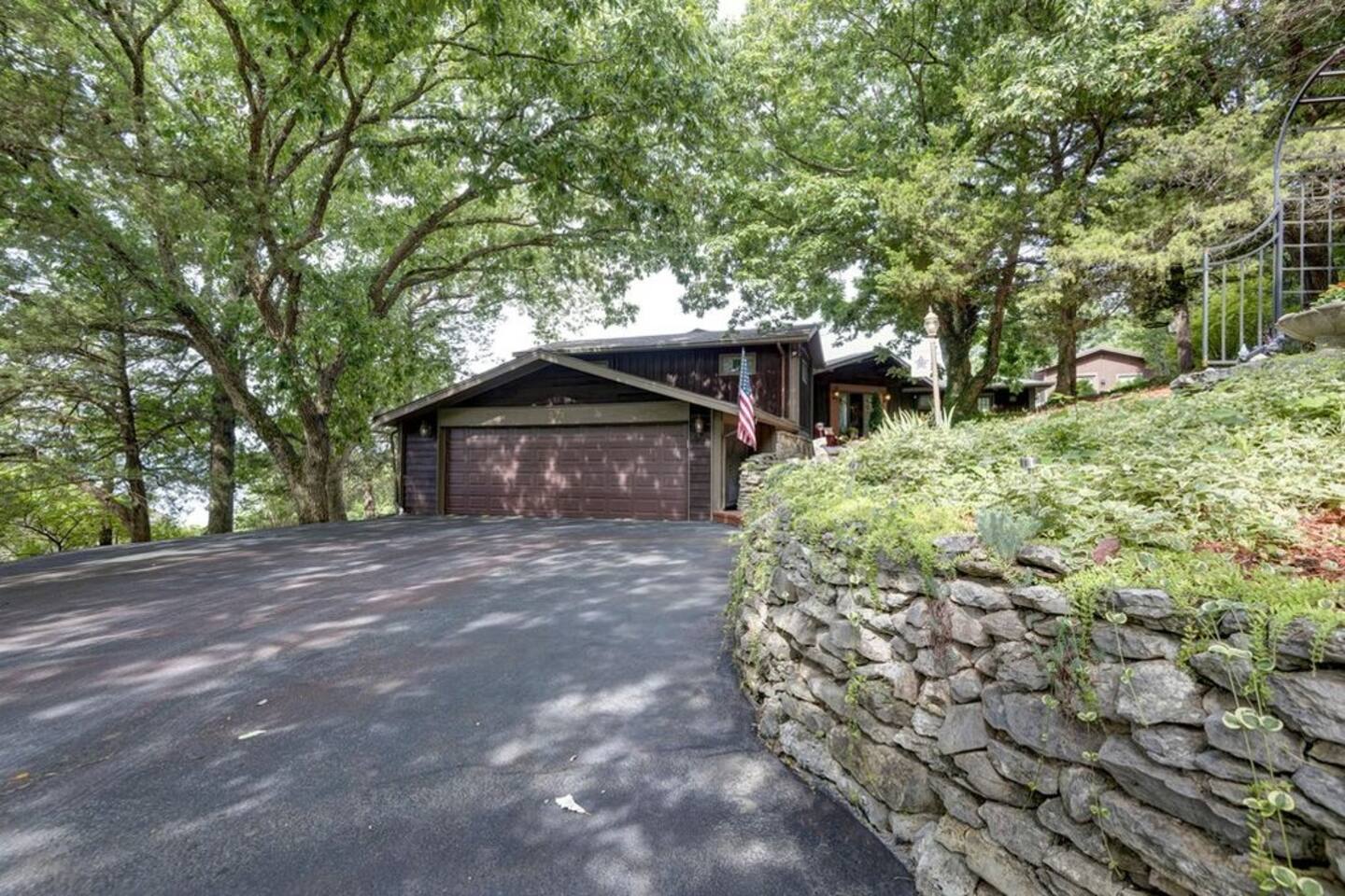 Experience Nature's Beauty and Lakefront Leisure at Our Charming Table Rock Lake Retreat in the Ozark Mountains! Step into the great outdoors and relish in the serene beauty of the deck and fenced yard, where you might even catch a glimpse of the local wildlife roaming the gardens. Ample parking awaits your group, with room to accommodate your boat(s) for a truly adventurous escape. Large driveway and newly paved road for easy access. Yearning for more space? Discover our adjacent house across the street, also available for rent. Unwind by the built-in fire pit on the back deck and relax in abundant seating, perfect for your entire group to savor the breathtaking views after a thrilling day on the lake. Only 10 minutes away, Kimberling City Marina beckons you for endless lake adventures, while a mere 5-minute drive leads you to the Joe Bald Boat Ramp and day-use area, ideal for launching your boat or renting one for an action-packed day on the water. And for family fun, Silver Dollar City is just a 20-minute drive away. Head to Branson for a delightful show or explore the vibrant Branson Strip, and then return to our splendid home to luxuriate in its abundant comforts. Our main home boasts four bedrooms, with the master suite offering spacious comfort, an attached walk-in cedar-lined closet, and an en suite bathroom complete with a jetted tub and shower. Two additional bedrooms feature cozy queen beds, while a bunk room awaits the kids with a single bed and trundle, plus a bunk bed for added fun. Relax in two distinct living areas, with the main floor living room featuring vaulted cedar ceilings, a charming wood stove insert, and plenty of plush seating. The sofa also folds out into a queen sleeper. The open floor plan living and dining room offers a grand custom dining table where the whole family can gather. Venture downstairs to a cozy movie room with deep seating. We've even provided a popcorn machine, games, and puzzles to make your stay truly unforgettable. The fourth bedroom downstairs features a comfy queen bed. Discover the cottage, an open-concept living, kitchen, and bedroom space with a separate enclosed bathroom. Located off the back deck and accessible via a small staircase, it boasts its own private deck with delightful views. The property features expansive outdoor spaces and a fenced yard off the back deck for added convenience. Rest assured, cleanliness is a top priority, and we strive to provide you with everything you need to feel at home, from quality towels and linens to a well-stocked kitchen and comfortable living spaces. We take pride in going above and beyond to offer those special touches you may not find elsewhere. Please note that we do not permit pets, events, or parties of any kind, and we kindly ask that you respect both the home and the neighborhood. For your peace of mind and security, we have exterior cameras on the front door and garage. Quiet hours from 10:00 PM to 8:00 AM are to be strictly observed, and we are always nearby and available to assist with any questions or concerns. Connect with us on social media @branson_rentals and discover Branson Lakes Lodging for your next unforgettable getaway!