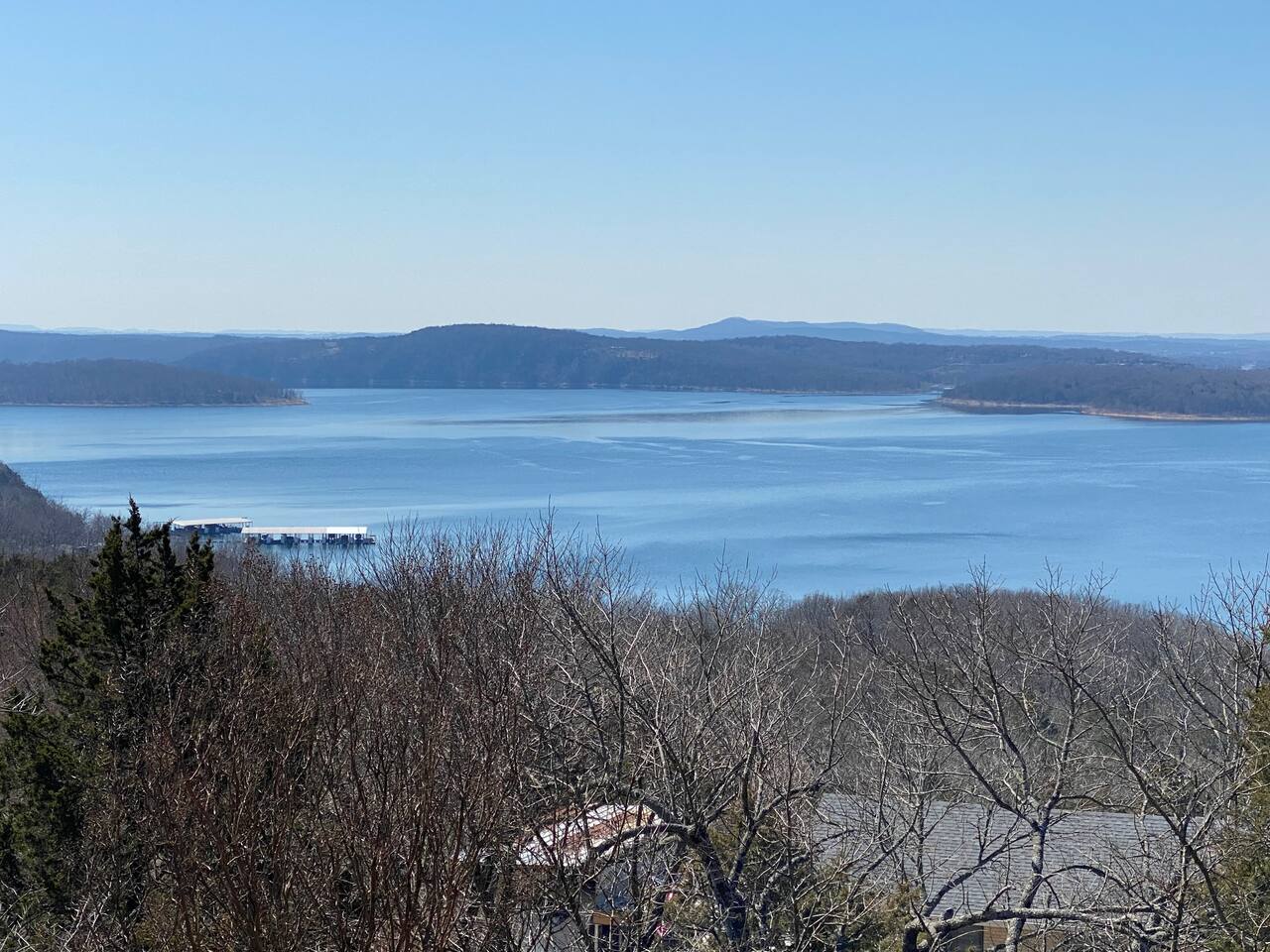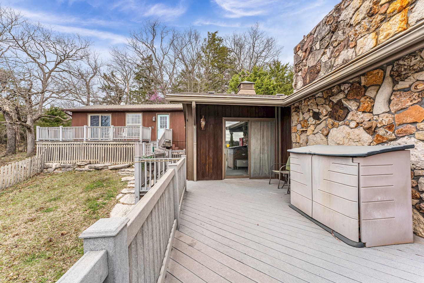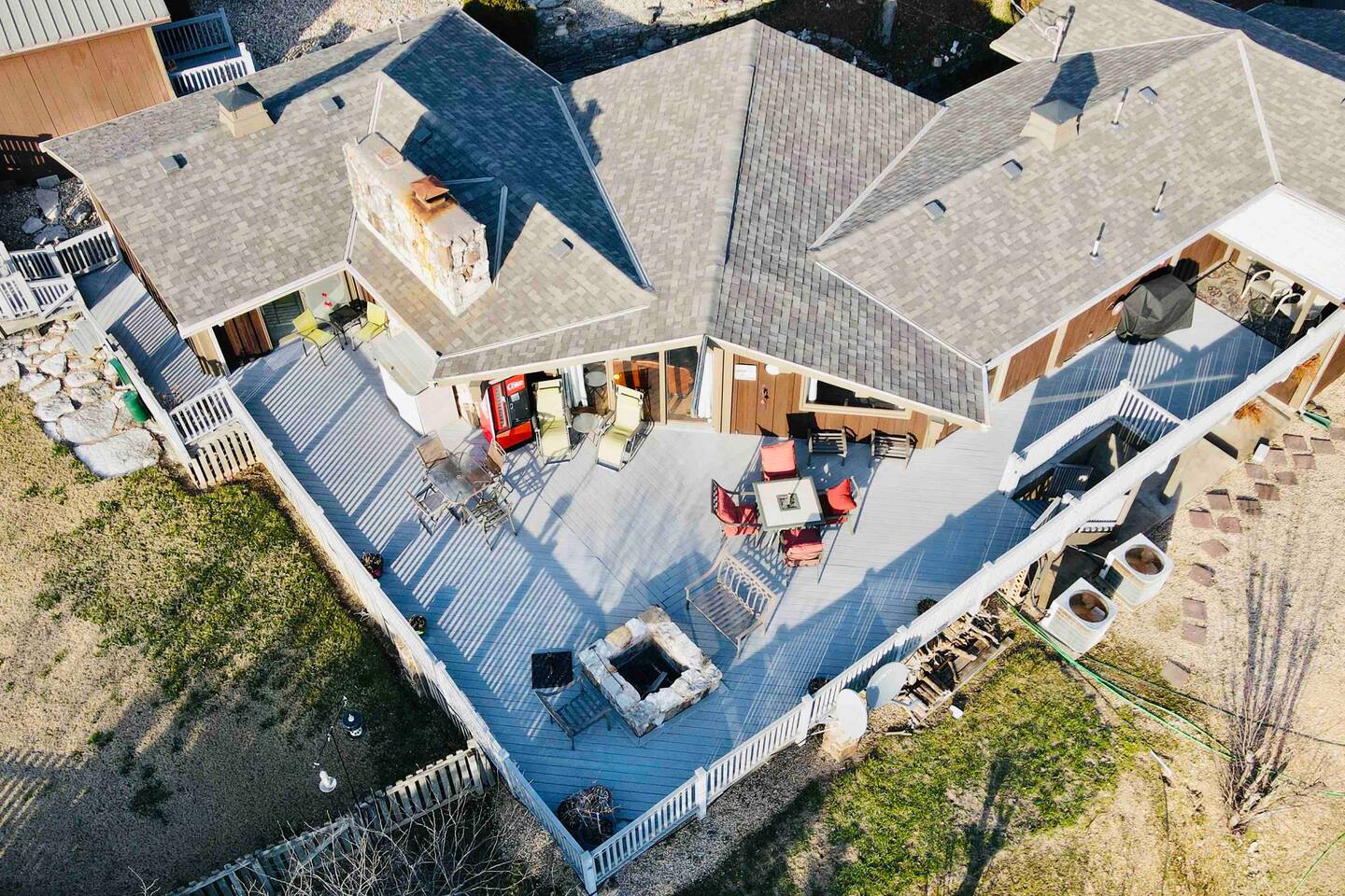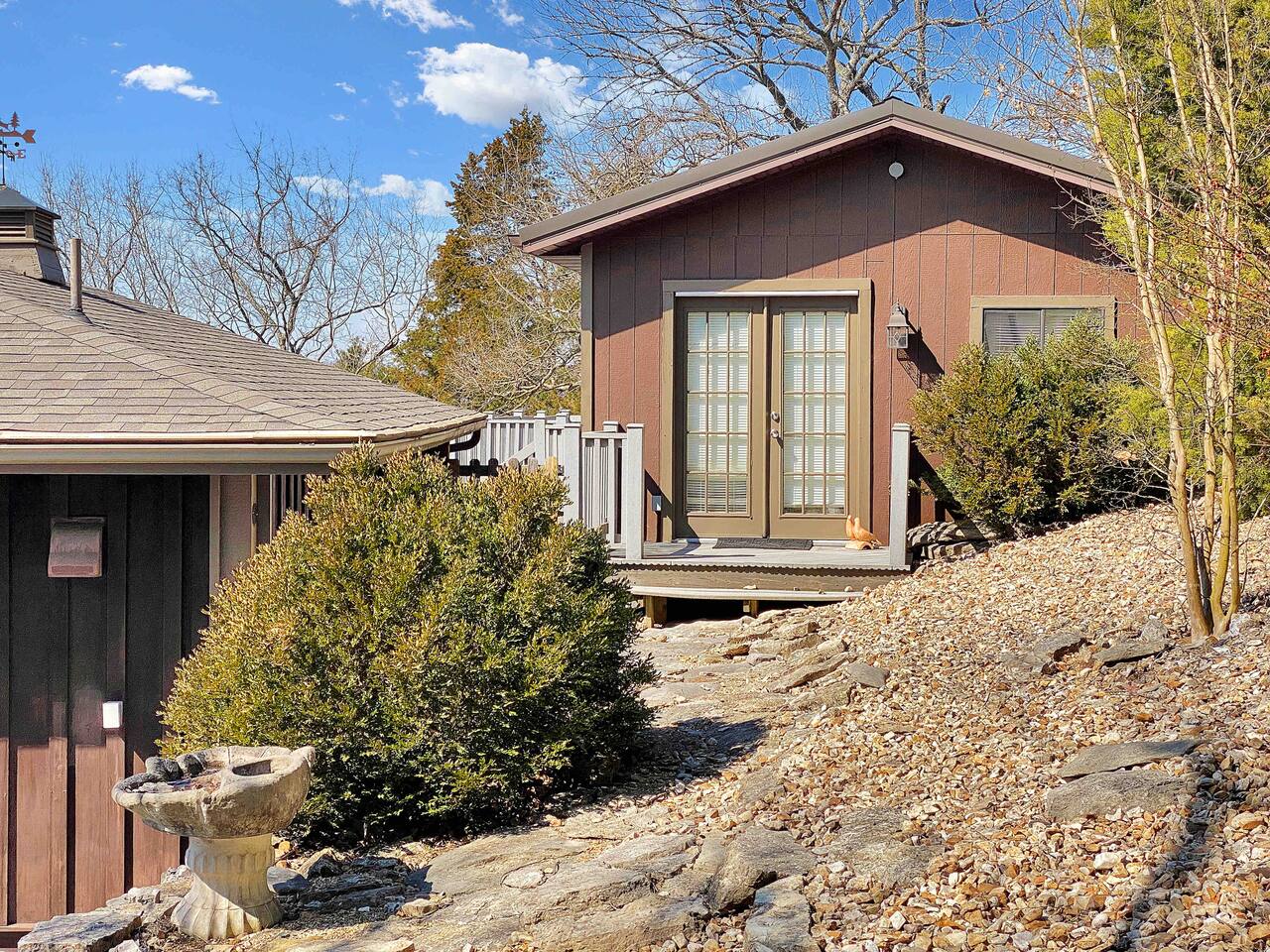 Experience Nature's Beauty and Lakefront Leisure at Our Charming Table Rock Lake Retreat in the Ozark Mountains! Step into the great outdoors and relish in the serene beauty of the deck and fenced yard, where you might even catch a glimpse of the local wildlife roaming the gardens. Ample parking awaits your group, with room to accommodate your boat(s) for a truly adventurous escape. Large driveway and newly paved road for easy access. Yearning for more space? Discover our adjacent house across the street, also available for rent. Unwind by the built-in fire pit on the back deck and relax in abundant seating, perfect for your entire group to savor the breathtaking views after a thrilling day on the lake. Only 10 minutes away, Kimberling City Marina beckons you for endless lake adventures, while a mere 5-minute drive leads you to the Joe Bald Boat Ramp and day-use area, ideal for launching your boat or renting one for an action-packed day on the water. And for family fun, Silver Dollar City is just a 20-minute drive away. Head to Branson for a delightful show or explore the vibrant Branson Strip, and then return to our splendid home to luxuriate in its abundant comforts. Our main home boasts four bedrooms, with the master suite offering spacious comfort, an attached walk-in cedar-lined closet, and an en suite bathroom complete with a jetted tub and shower. Two additional bedrooms feature cozy queen beds, while a bunk room awaits the kids with a single bed and trundle, plus a bunk bed for added fun. Relax in two distinct living areas, with the main floor living room featuring vaulted cedar ceilings, a charming wood stove insert, and plenty of plush seating. The sofa also folds out into a queen sleeper. The open floor plan living and dining room offers a grand custom dining table where the whole family can gather. Venture downstairs to a cozy movie room with deep seating. We've even provided a popcorn machine, games, and puzzles to make your stay truly unforgettable. The fourth bedroom downstairs features a comfy queen bed. Discover the cottage, an open-concept living, kitchen, and bedroom space with a separate enclosed bathroom. Located off the back deck and accessible via a small staircase, it boasts its own private deck with delightful views. The property features expansive outdoor spaces and a fenced yard off the back deck for added convenience. Rest assured, cleanliness is a top priority, and we strive to provide you with everything you need to feel at home, from quality towels and linens to a well-stocked kitchen and comfortable living spaces. We take pride in going above and beyond to offer those special touches you may not find elsewhere. Please note that we do not permit pets, events, or parties of any kind, and we kindly ask that you respect both the home and the neighborhood. For your peace of mind and security, we have exterior cameras on the front door and garage. Quiet hours from 10:00 PM to 8:00 AM are to be strictly observed, and we are always nearby and available to assist with any questions or concerns. Connect with us on social media @branson_rentals and discover Branson Lakes Lodging for your next unforgettable getaway!