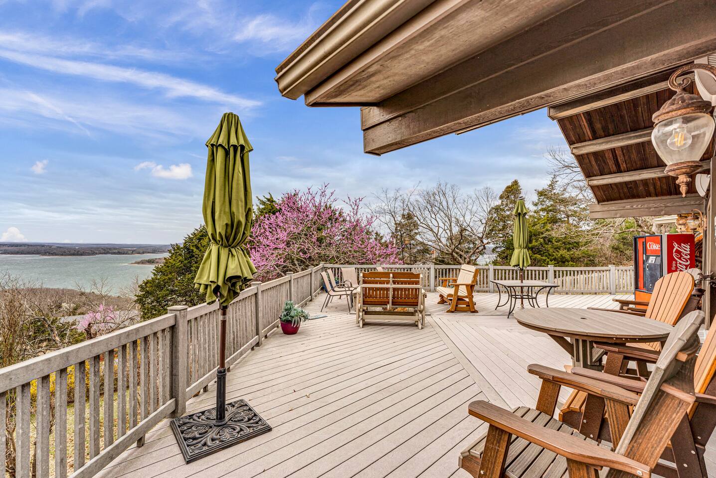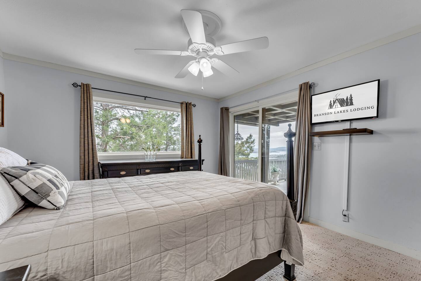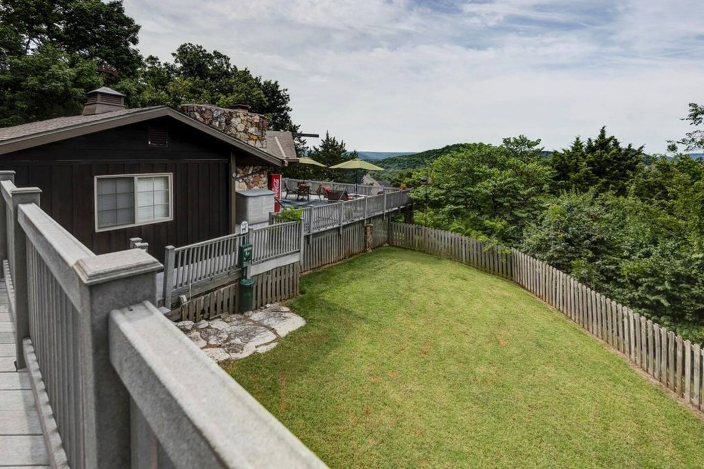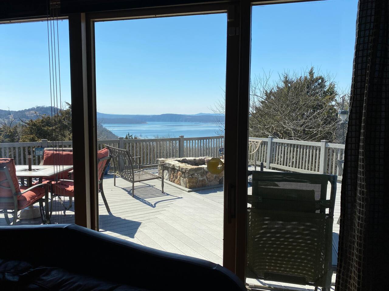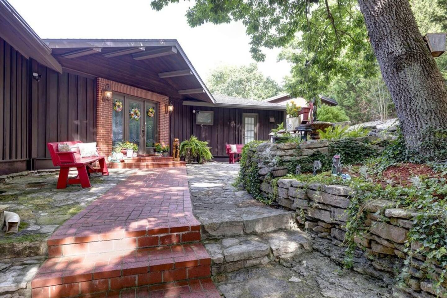 Experience Nature's Beauty and Lakefront Leisure at Our Charming Table Rock Lake Retreat in the Ozark Mountains! Step into the great outdoors and relish in the serene beauty of the deck and fenced yard, where you might even catch a glimpse of the local wildlife roaming the gardens. Ample parking awaits your group, with room to accommodate your boat(s) for a truly adventurous escape. Large driveway and newly paved road for easy access. Yearning for more space? Discover our adjacent house across the street, also available for rent. Unwind by the built-in fire pit on the back deck and relax in abundant seating, perfect for your entire group to savor the breathtaking views after a thrilling day on the lake. Only 10 minutes away, Kimberling City Marina beckons you for endless lake adventures, while a mere 5-minute drive leads you to the Joe Bald Boat Ramp and day-use area, ideal for launching your boat or renting one for an action-packed day on the water. And for family fun, Silver Dollar City is just a 20-minute drive away. Head to Branson for a delightful show or explore the vibrant Branson Strip, and then return to our splendid home to luxuriate in its abundant comforts. Our main home boasts four bedrooms, with the master suite offering spacious comfort, an attached walk-in cedar-lined closet, and an en suite bathroom complete with a jetted tub and shower. Two additional bedrooms feature cozy queen beds, while a bunk room awaits the kids with a single bed and trundle, plus a bunk bed for added fun. Relax in two distinct living areas, with the main floor living room featuring vaulted cedar ceilings, a charming wood stove insert, and plenty of plush seating. The sofa also folds out into a queen sleeper. The open floor plan living and dining room offers a grand custom dining table where the whole family can gather. Venture downstairs to a cozy movie room with deep seating. We've even provided a popcorn machine, games, and puzzles to make your stay truly unforgettable. The fourth bedroom downstairs features a comfy queen bed. Discover the cottage, an open-concept living, kitchen, and bedroom space with a separate enclosed bathroom. Located off the back deck and accessible via a small staircase, it boasts its own private deck with delightful views. The property features expansive outdoor spaces and a fenced yard off the back deck for added convenience. Rest assured, cleanliness is a top priority, and we strive to provide you with everything you need to feel at home, from quality towels and linens to a well-stocked kitchen and comfortable living spaces. We take pride in going above and beyond to offer those special touches you may not find elsewhere. Please note that we do not permit pets, events, or parties of any kind, and we kindly ask that you respect both the home and the neighborhood. For your peace of mind and security, we have exterior cameras on the front door and garage. Quiet hours from 10:00 PM to 8:00 AM are to be strictly observed, and we are always nearby and available to assist with any questions or concerns. Connect with us on social media @branson_rentals and discover Branson Lakes Lodging for your next unforgettable getaway!