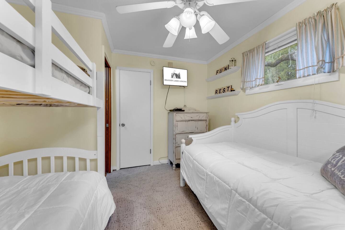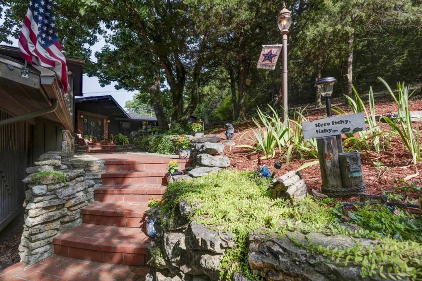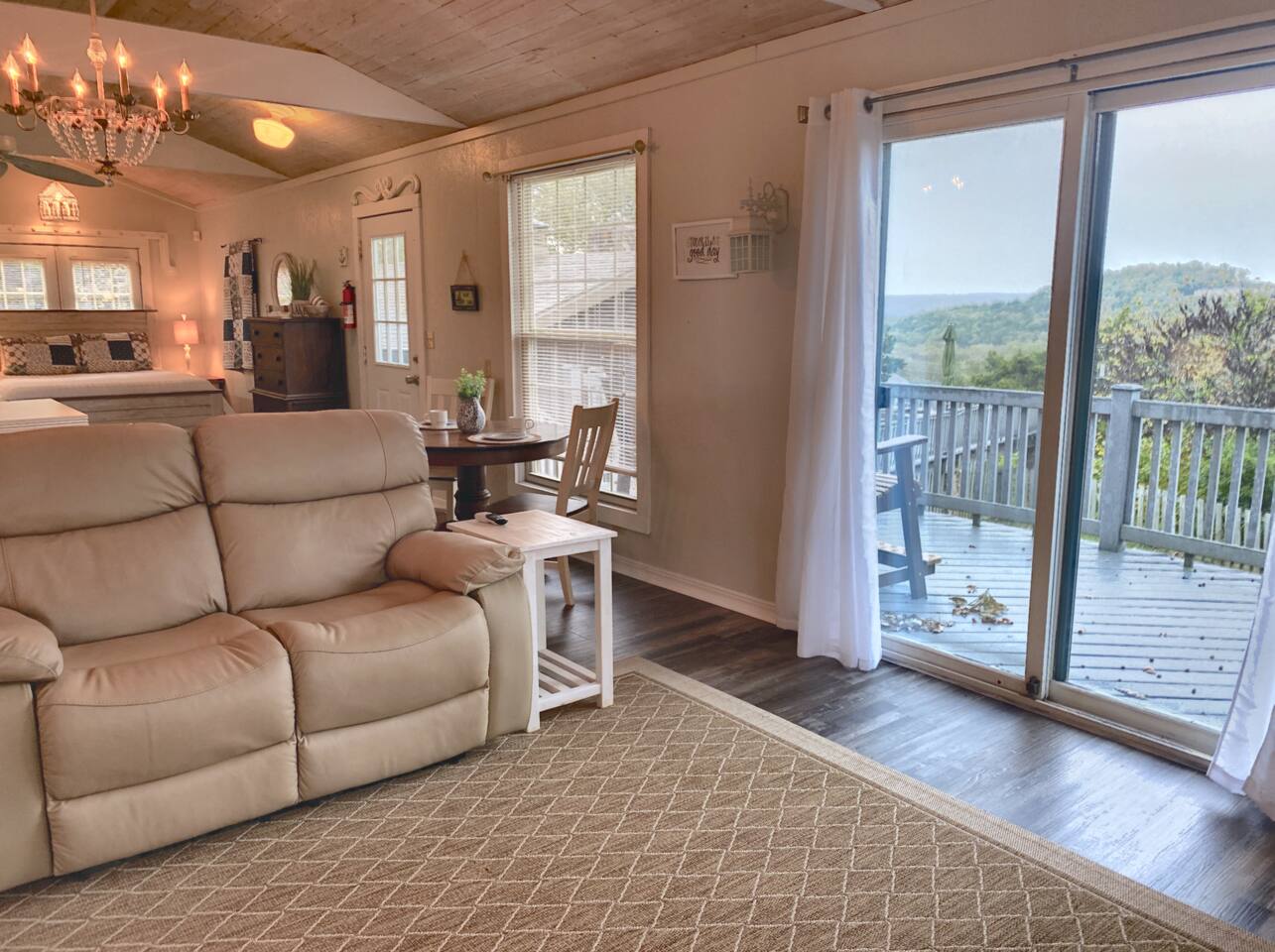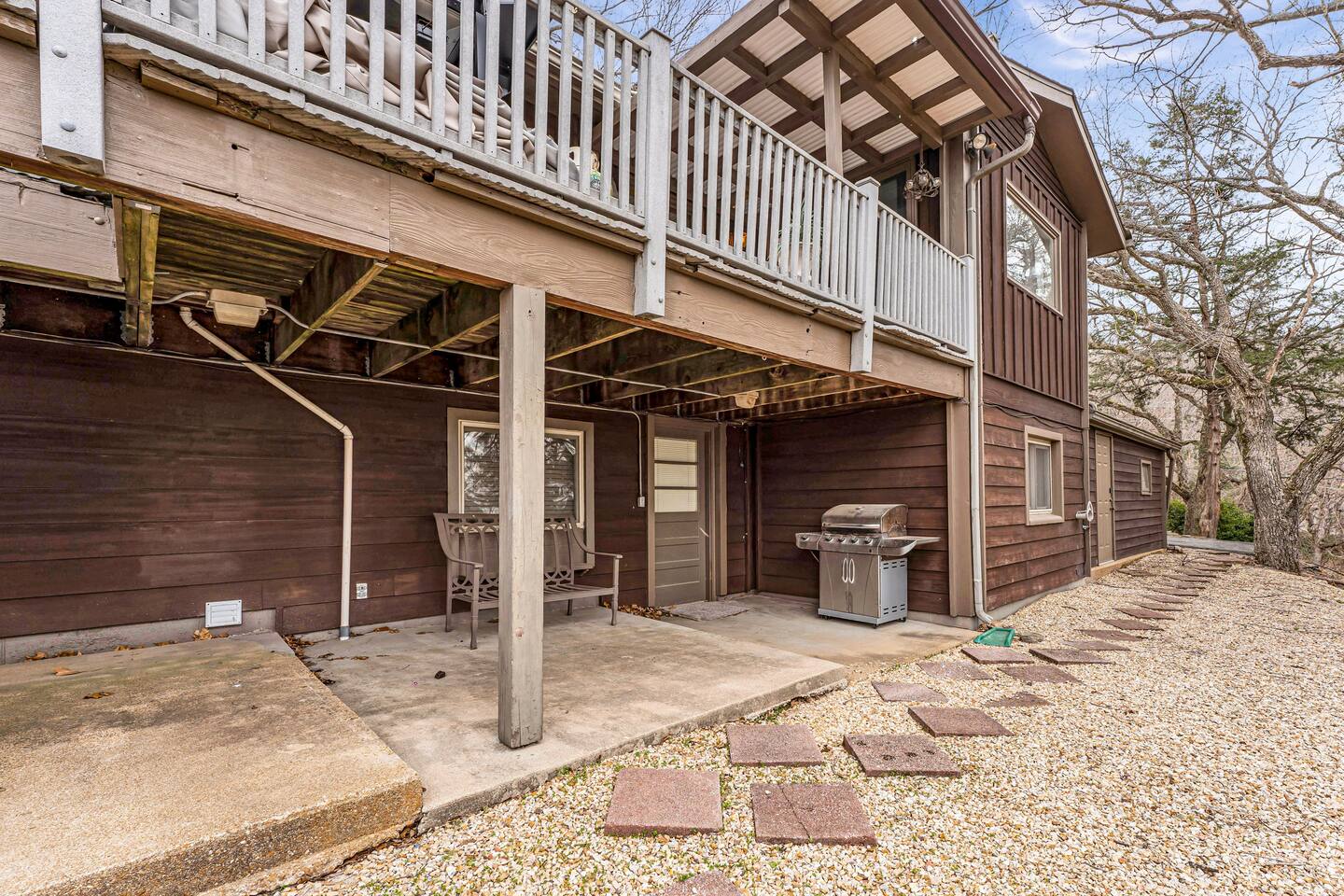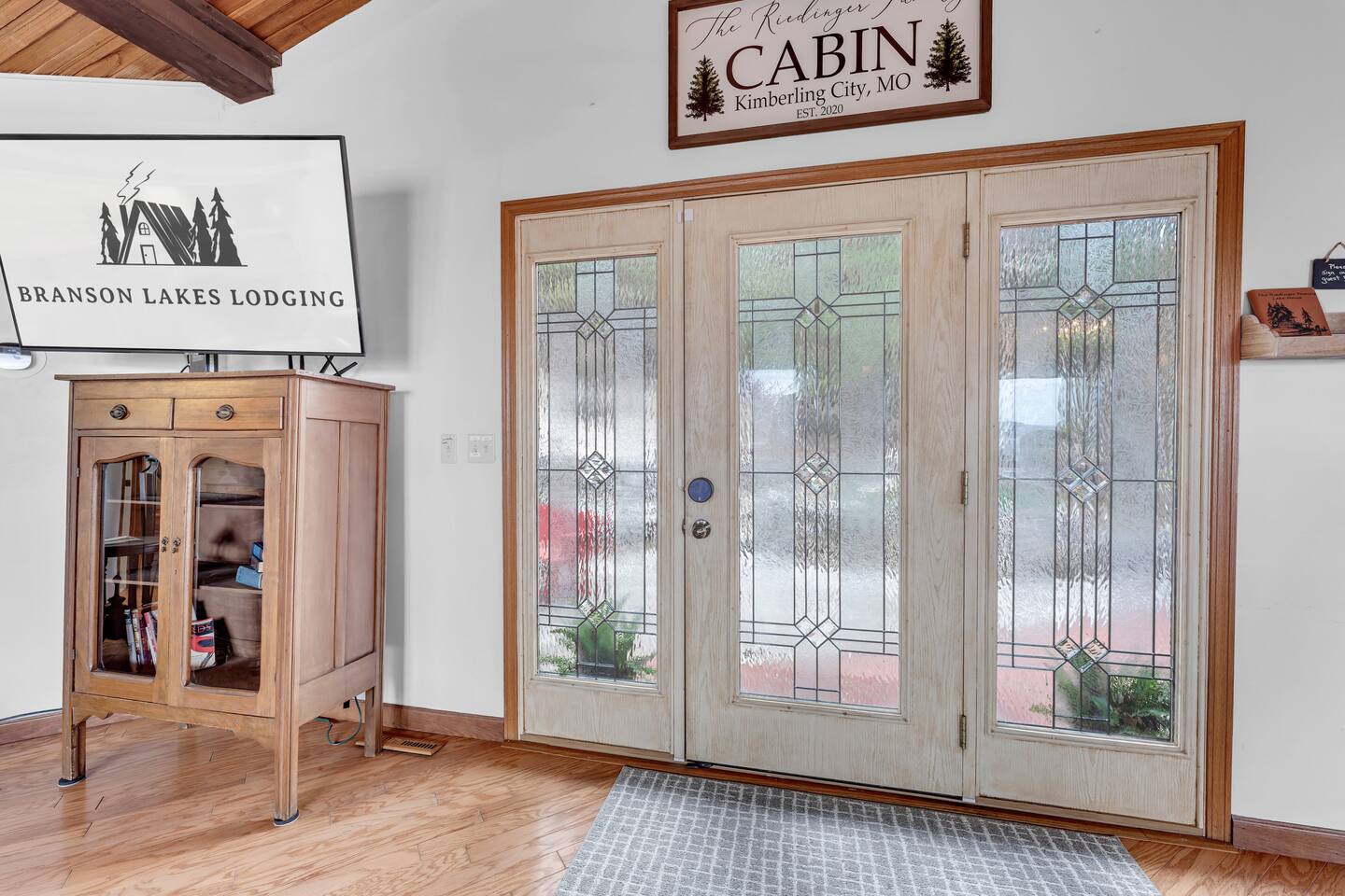 Experience Nature's Beauty and Lakefront Leisure at Our Charming Table Rock Lake Retreat in the Ozark Mountains! Step into the great outdoors and relish in the serene beauty of the deck and fenced yard, where you might even catch a glimpse of the local wildlife roaming the gardens. Ample parking awaits your group, with room to accommodate your boat(s) for a truly adventurous escape. Large driveway and newly paved road for easy access. Yearning for more space? Discover our adjacent house across the street, also available for rent. Unwind by the built-in fire pit on the back deck and relax in abundant seating, perfect for your entire group to savor the breathtaking views after a thrilling day on the lake. Only 10 minutes away, Kimberling City Marina beckons you for endless lake adventures, while a mere 5-minute drive leads you to the Joe Bald Boat Ramp and day-use area, ideal for launching your boat or renting one for an action-packed day on the water. And for family fun, Silver Dollar City is just a 20-minute drive away. Head to Branson for a delightful show or explore the vibrant Branson Strip, and then return to our splendid home to luxuriate in its abundant comforts. Our main home boasts four bedrooms, with the master suite offering spacious comfort, an attached walk-in cedar-lined closet, and an en suite bathroom complete with a jetted tub and shower. Two additional bedrooms feature cozy queen beds, while a bunk room awaits the kids with a single bed and trundle, plus a bunk bed for added fun. Relax in two distinct living areas, with the main floor living room featuring vaulted cedar ceilings, a charming wood stove insert, and plenty of plush seating. The sofa also folds out into a queen sleeper. The open floor plan living and dining room offers a grand custom dining table where the whole family can gather. Venture downstairs to a cozy movie room with deep seating. We've even provided a popcorn machine, games, and puzzles to make your stay truly unforgettable. The fourth bedroom downstairs features a comfy queen bed. Discover the cottage, an open-concept living, kitchen, and bedroom space with a separate enclosed bathroom. Located off the back deck and accessible via a small staircase, it boasts its own private deck with delightful views. The property features expansive outdoor spaces and a fenced yard off the back deck for added convenience. Rest assured, cleanliness is a top priority, and we strive to provide you with everything you need to feel at home, from quality towels and linens to a well-stocked kitchen and comfortable living spaces. We take pride in going above and beyond to offer those special touches you may not find elsewhere. Please note that we do not permit pets, events, or parties of any kind, and we kindly ask that you respect both the home and the neighborhood. For your peace of mind and security, we have exterior cameras on the front door and garage. Quiet hours from 10:00 PM to 8:00 AM are to be strictly observed, and we are always nearby and available to assist with any questions or concerns. Connect with us on social media @branson_rentals and discover Branson Lakes Lodging for your next unforgettable getaway!