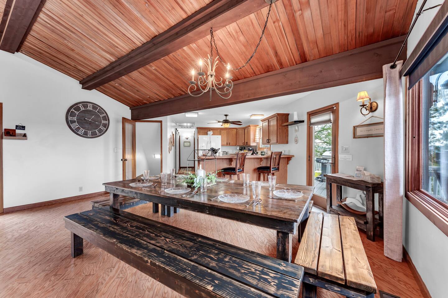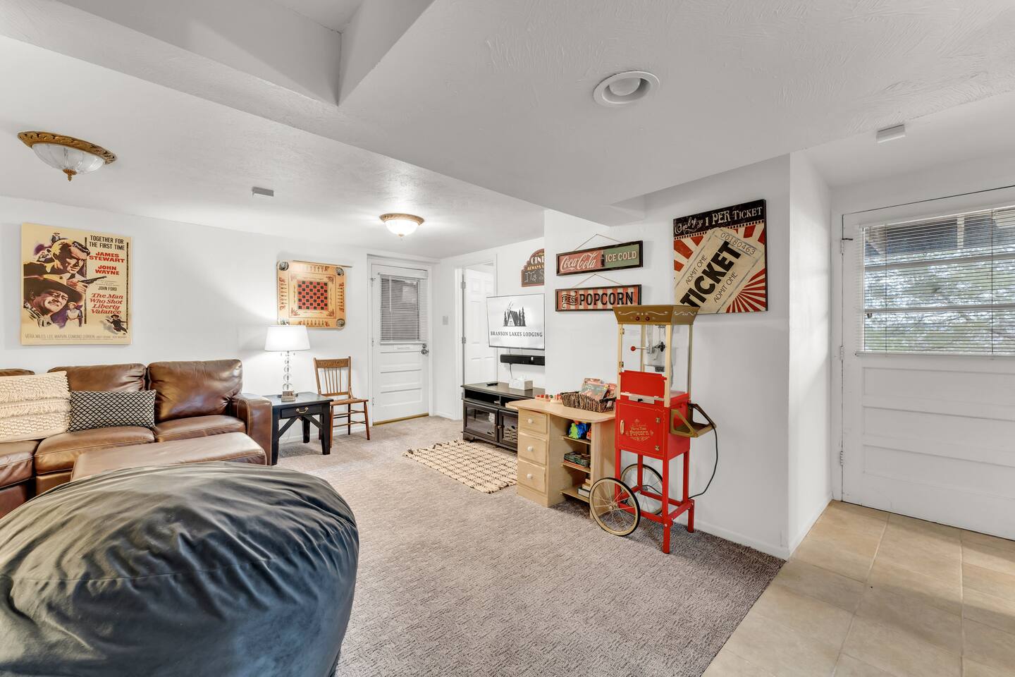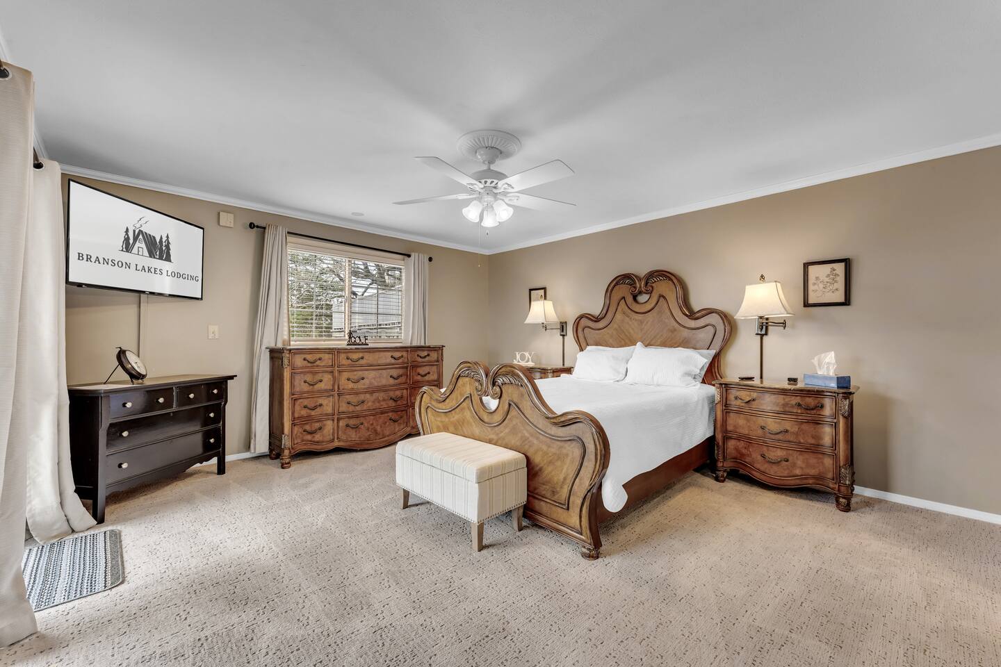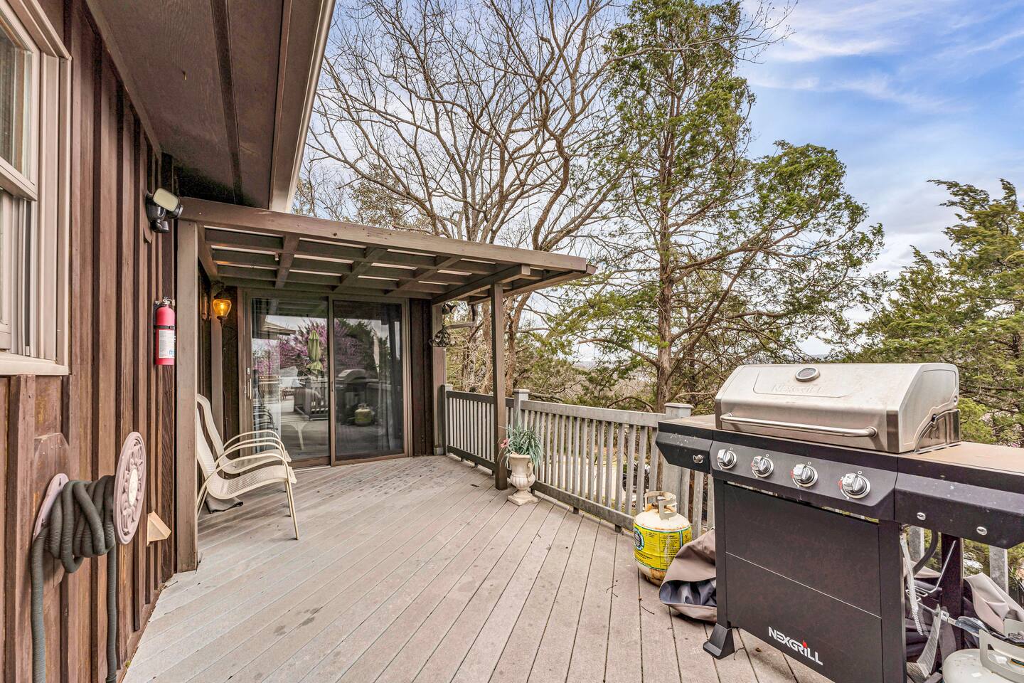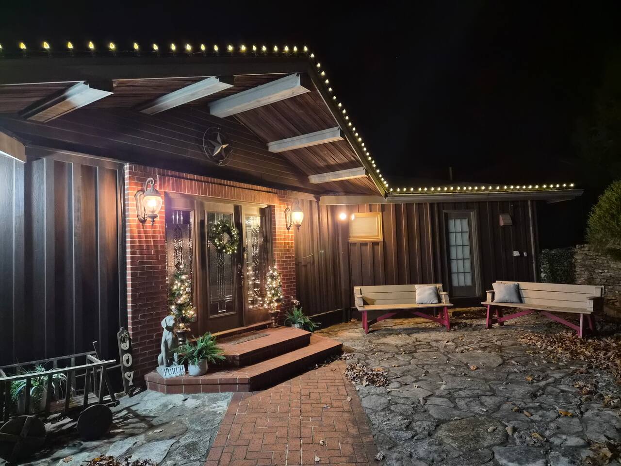 Experience Nature's Beauty and Lakefront Leisure at Our Charming Table Rock Lake Retreat in the Ozark Mountains! Step into the great outdoors and relish in the serene beauty of the deck and fenced yard, where you might even catch a glimpse of the local wildlife roaming the gardens. Ample parking awaits your group, with room to accommodate your boat(s) for a truly adventurous escape. Large driveway and newly paved road for easy access. Yearning for more space? Discover our adjacent house across the street, also available for rent. Unwind by the built-in fire pit on the back deck and relax in abundant seating, perfect for your entire group to savor the breathtaking views after a thrilling day on the lake. Only 10 minutes away, Kimberling City Marina beckons you for endless lake adventures, while a mere 5-minute drive leads you to the Joe Bald Boat Ramp and day-use area, ideal for launching your boat or renting one for an action-packed day on the water. And for family fun, Silver Dollar City is just a 20-minute drive away. Head to Branson for a delightful show or explore the vibrant Branson Strip, and then return to our splendid home to luxuriate in its abundant comforts. Our main home boasts four bedrooms, with the master suite offering spacious comfort, an attached walk-in cedar-lined closet, and an en suite bathroom complete with a jetted tub and shower. Two additional bedrooms feature cozy queen beds, while a bunk room awaits the kids with a single bed and trundle, plus a bunk bed for added fun. Relax in two distinct living areas, with the main floor living room featuring vaulted cedar ceilings, a charming wood stove insert, and plenty of plush seating. The sofa also folds out into a queen sleeper. The open floor plan living and dining room offers a grand custom dining table where the whole family can gather. Venture downstairs to a cozy movie room with deep seating. We've even provided a popcorn machine, games, and puzzles to make your stay truly unforgettable. The fourth bedroom downstairs features a comfy queen bed. Discover the cottage, an open-concept living, kitchen, and bedroom space with a separate enclosed bathroom. Located off the back deck and accessible via a small staircase, it boasts its own private deck with delightful views. The property features expansive outdoor spaces and a fenced yard off the back deck for added convenience. Rest assured, cleanliness is a top priority, and we strive to provide you with everything you need to feel at home, from quality towels and linens to a well-stocked kitchen and comfortable living spaces. We take pride in going above and beyond to offer those special touches you may not find elsewhere. Please note that we do not permit pets, events, or parties of any kind, and we kindly ask that you respect both the home and the neighborhood. For your peace of mind and security, we have exterior cameras on the front door and garage. Quiet hours from 10:00 PM to 8:00 AM are to be strictly observed, and we are always nearby and available to assist with any questions or concerns. Connect with us on social media @branson_rentals and discover Branson Lakes Lodging for your next unforgettable getaway!