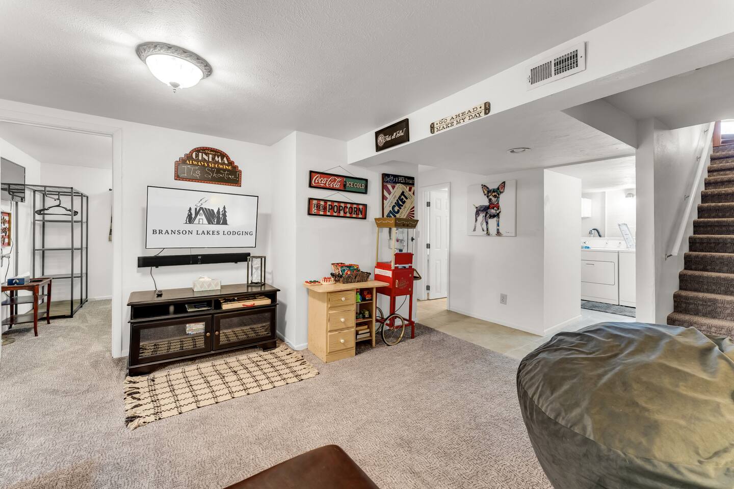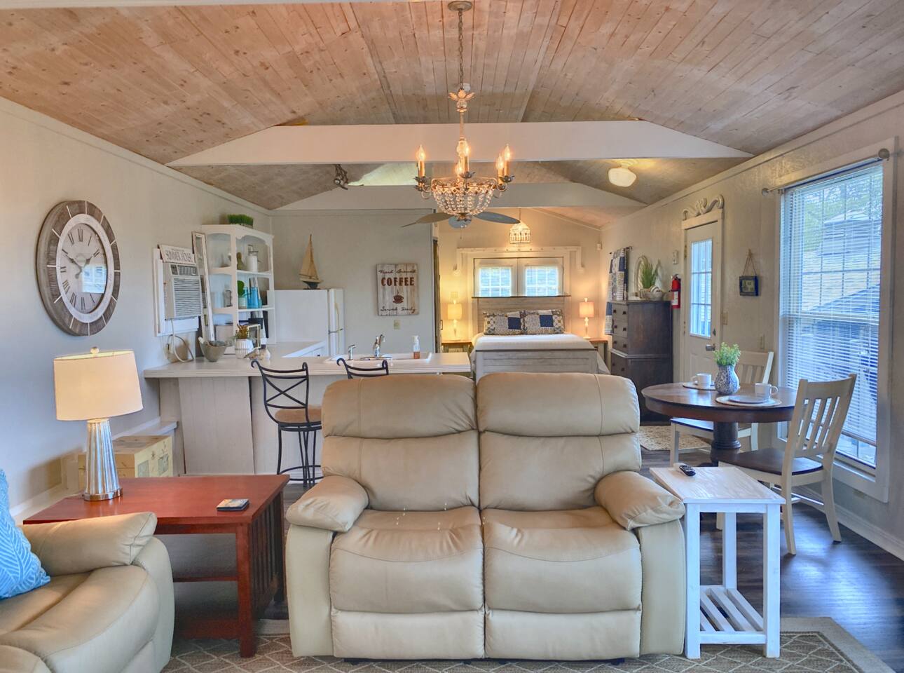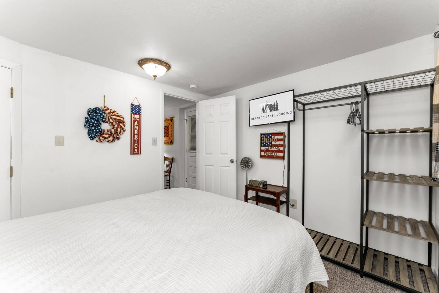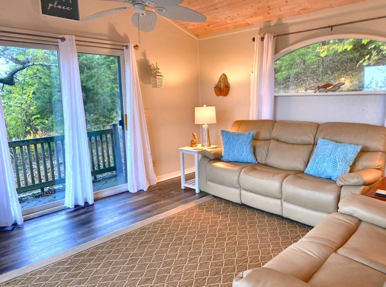 Experience Nature's Beauty and Lakefront Leisure at Our Charming Table Rock Lake Retreat in the Ozark Mountains! Step into the great outdoors and relish in the serene beauty of the deck and fenced yard, where you might even catch a glimpse of the local wildlife roaming the gardens. Ample parking awaits your group, with room to accommodate your boat(s) for a truly adventurous escape. Large driveway and newly paved road for easy access. Yearning for more space? Discover our adjacent house across the street, also available for rent. Unwind by the built-in fire pit on the back deck and relax in abundant seating, perfect for your entire group to savor the breathtaking views after a thrilling day on the lake. Only 10 minutes away, Kimberling City Marina beckons you for endless lake adventures, while a mere 5-minute drive leads you to the Joe Bald Boat Ramp and day-use area, ideal for launching your boat or renting one for an action-packed day on the water. And for family fun, Silver Dollar City is just a 20-minute drive away. Head to Branson for a delightful show or explore the vibrant Branson Strip, and then return to our splendid home to luxuriate in its abundant comforts. Our main home boasts four bedrooms, with the master suite offering spacious comfort, an attached walk-in cedar-lined closet, and an en suite bathroom complete with a jetted tub and shower. Two additional bedrooms feature cozy queen beds, while a bunk room awaits the kids with a single bed and trundle, plus a bunk bed for added fun. Relax in two distinct living areas, with the main floor living room featuring vaulted cedar ceilings, a charming wood stove insert, and plenty of plush seating. The sofa also folds out into a queen sleeper. The open floor plan living and dining room offers a grand custom dining table where the whole family can gather. Venture downstairs to a cozy movie room with deep seating. We've even provided a popcorn machine, games, and puzzles to make your stay truly unforgettable. The fourth bedroom downstairs features a comfy queen bed. Discover the cottage, an open-concept living, kitchen, and bedroom space with a separate enclosed bathroom. Located off the back deck and accessible via a small staircase, it boasts its own private deck with delightful views. The property features expansive outdoor spaces and a fenced yard off the back deck for added convenience. Rest assured, cleanliness is a top priority, and we strive to provide you with everything you need to feel at home, from quality towels and linens to a well-stocked kitchen and comfortable living spaces. We take pride in going above and beyond to offer those special touches you may not find elsewhere. Please note that we do not permit pets, events, or parties of any kind, and we kindly ask that you respect both the home and the neighborhood. For your peace of mind and security, we have exterior cameras on the front door and garage. Quiet hours from 10:00 PM to 8:00 AM are to be strictly observed, and we are always nearby and available to assist with any questions or concerns. Connect with us on social media @branson_rentals and discover Branson Lakes Lodging for your next unforgettable getaway!