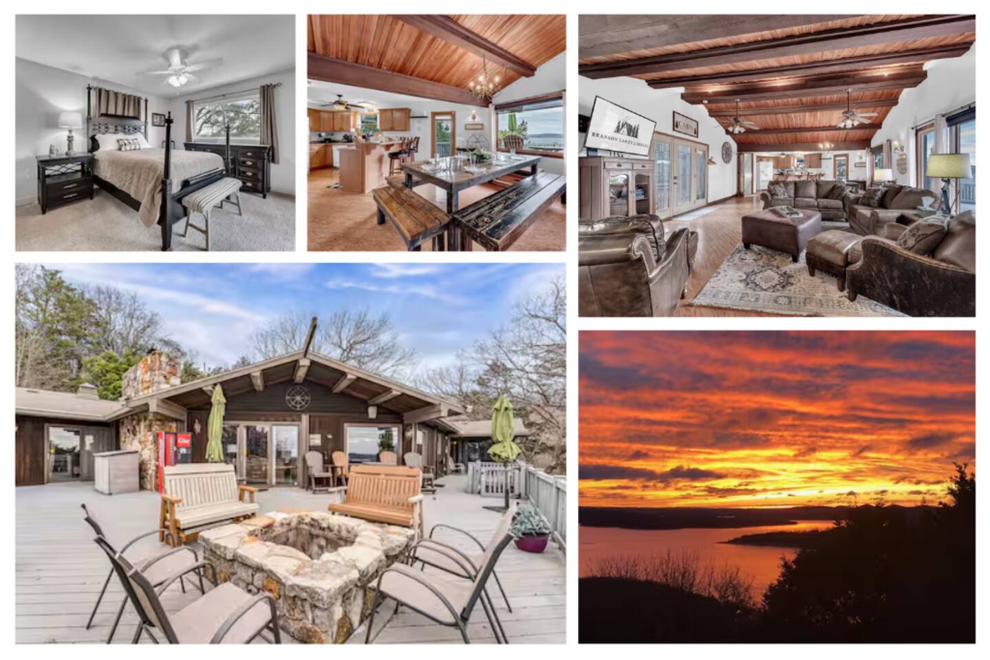 Experience Nature's Beauty and Lakefront Leisure at Our Charming Table Rock Lake Retreat in the Ozark Mountains! Luxury Table Rock Lake Retreat | 5BR + Private Cottage | Fire Pit + Lake Views Wake up to panoramic views of Table Rock Lake from your private back deck. This spacious 5-bedroom retreat with a separate guest cottage is designed for multi-family gatherings, lake weekends, and unforgettable group getaways in Kimberling City. With room for up to 12 guests, two living areas, a movie room, boat parking, fenced yard, and a built-in fire pit overlooking the water, this property offers the space and flexibility most lake homes simply don’t. Why Guests Love This Lake Compound • 5 bedrooms PLUS a private guest cottage • Expansive deck with million-dollar lake views • Built-in fire pit with ample seating • Two living areas + downstairs movie room • Boat parking + easy paved access • 10 min to Kimberling City Marina • 5 min to Joe Bald Boat Ramp • 20 min to Silver Dollar City • Quiet neighborhood setting The Space The main home features four comfortable bedrooms, including a spacious primary suite with an en suite bath and jetted tub. Two additional queen bedrooms and a bunk room make this perfect for families traveling together. The open-concept living and dining area showcases vaulted cedar ceilings, warm wood finishes, and a large custom dining table ideal for shared meals and game nights. The main living room offers plush seating and a wood stove insert for cozy evenings. Downstairs, guests will find a second living area and a dedicated movie room with deep seating, games, puzzles, and even a popcorn machine — perfect for rainy lake days. The Private Cottage (Rare Bonus Feature) Located just off the back deck, the separate guest cottage offers its own open-concept living space, kitchenette, bedroom area, full bathroom, and private deck with lake views. This layout is ideal for: • Grandparents wanting privacy • Couples traveling together • Teens needing space • Extended family stays Very few properties in this area offer this type of flexibility. Outdoor Living The expansive deck is the heart of the home, offering breathtaking views of Table Rock Lake. Relax around the built-in fire pit after a day on the water, enjoy morning coffee with wildlife sightings, or gather in the fenced yard for family time. With ample parking and room for boats, this property was designed for true lake living. Location Located in Kimberling City, Missouri: • 10 minutes to Kimberling City Marina • 5 minutes to Joe Bald Boat Ramp • 20 minutes to Silver Dollar City • 25–30 minutes to Branson shows & the Strip Enjoy lake serenity while staying close to all the entertainment and dining options Branson is known for. Good to Know • Sleeps up to 12 guests • No pets (owner allergy) • No parties or events • Exterior security cameras for safety • Quiet hours 10 PM – 8 AM • Primary renter must be 21+ We are nearby and available if needed, while respecting your privacy during your stay. Follow us @branson_rentals for more stunning Table Rock Lake vacation homes managed by Branson Lakes Lodging.