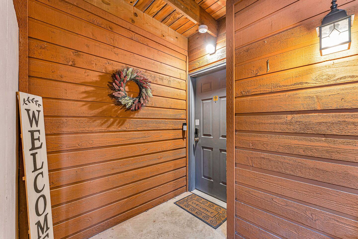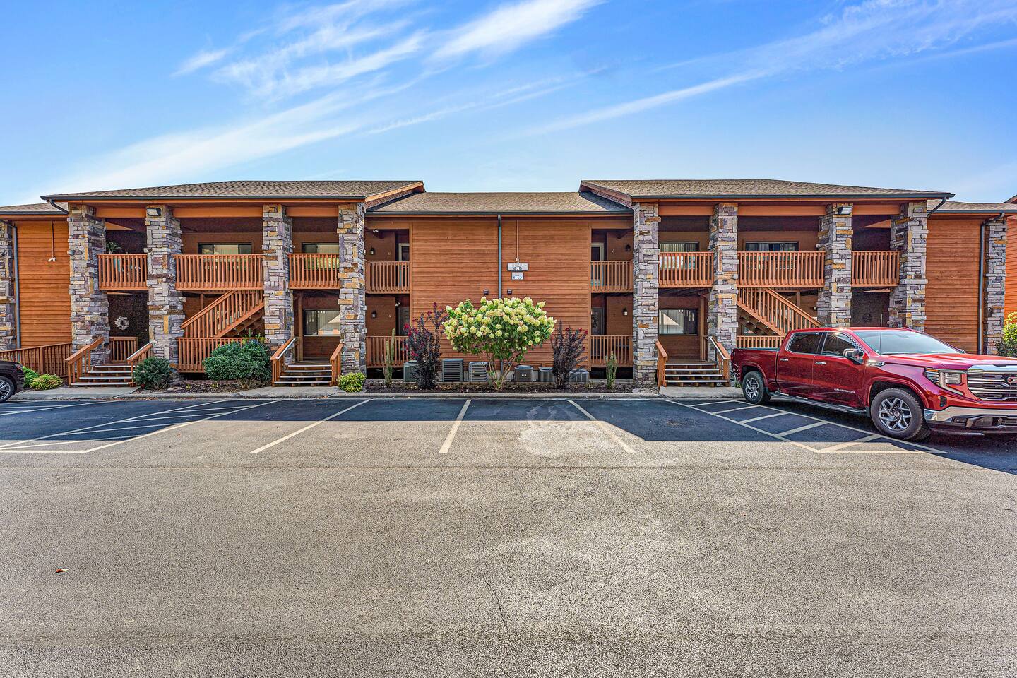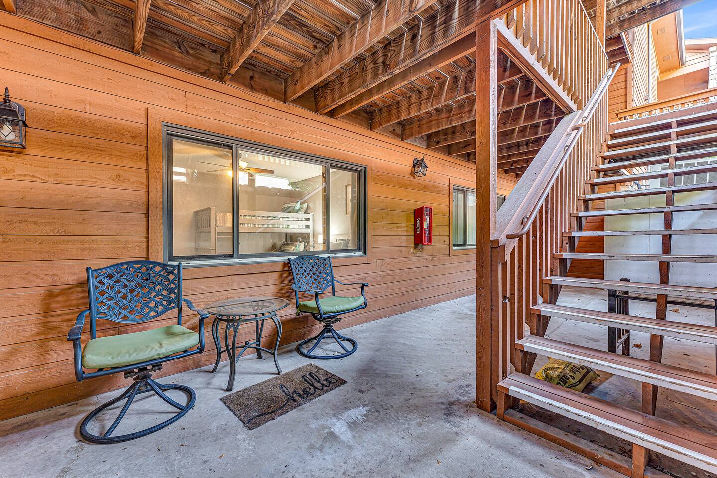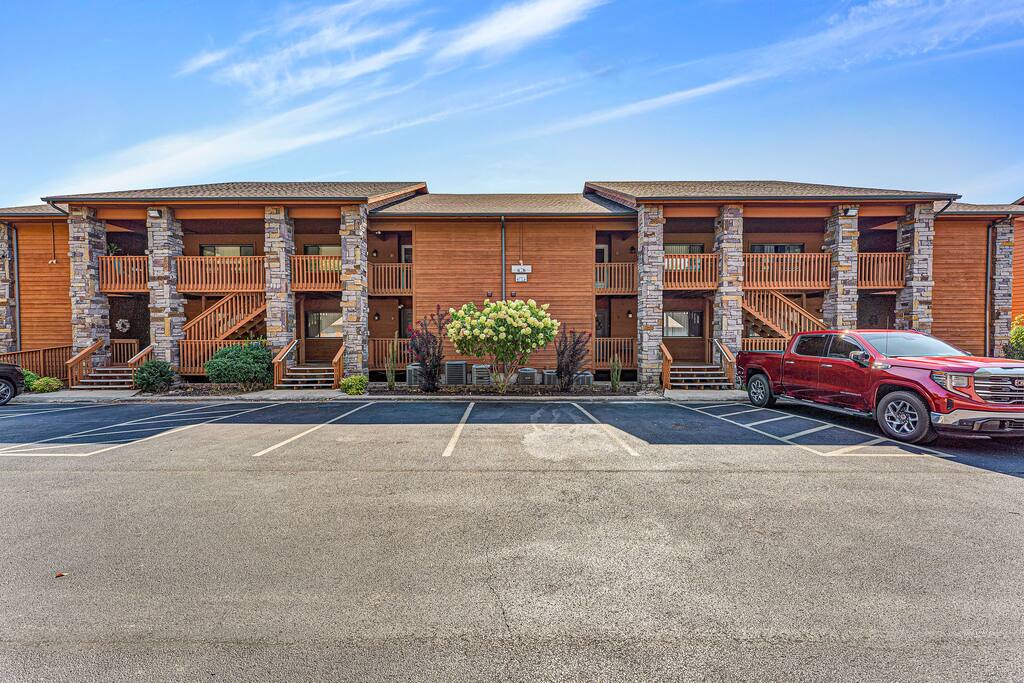 This condo is down one flight of stairs and the back of the condo walks directly out to ground level. You can walk to one of the resort pools from this condo. Indoor pool and hot tub are a short drive away.