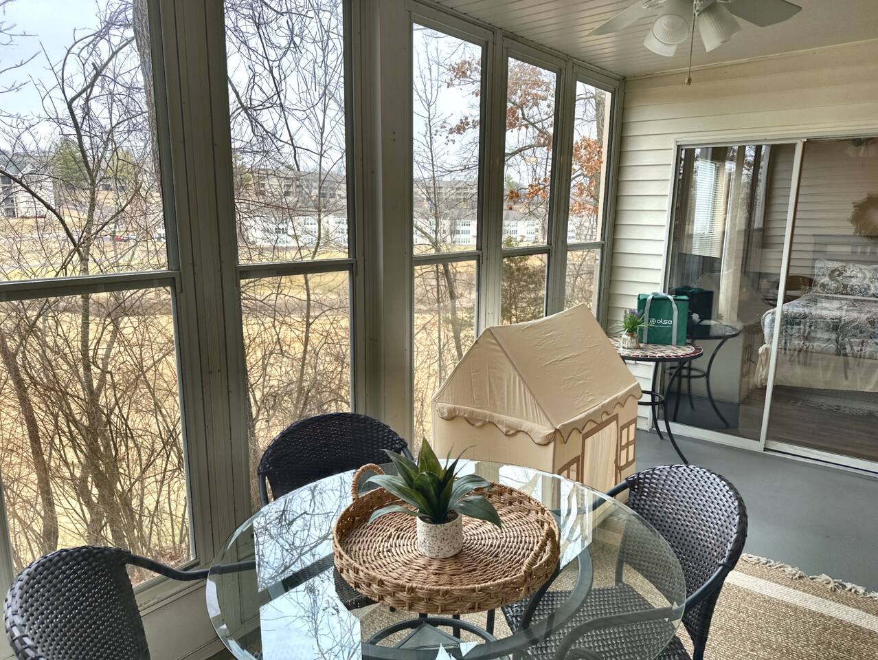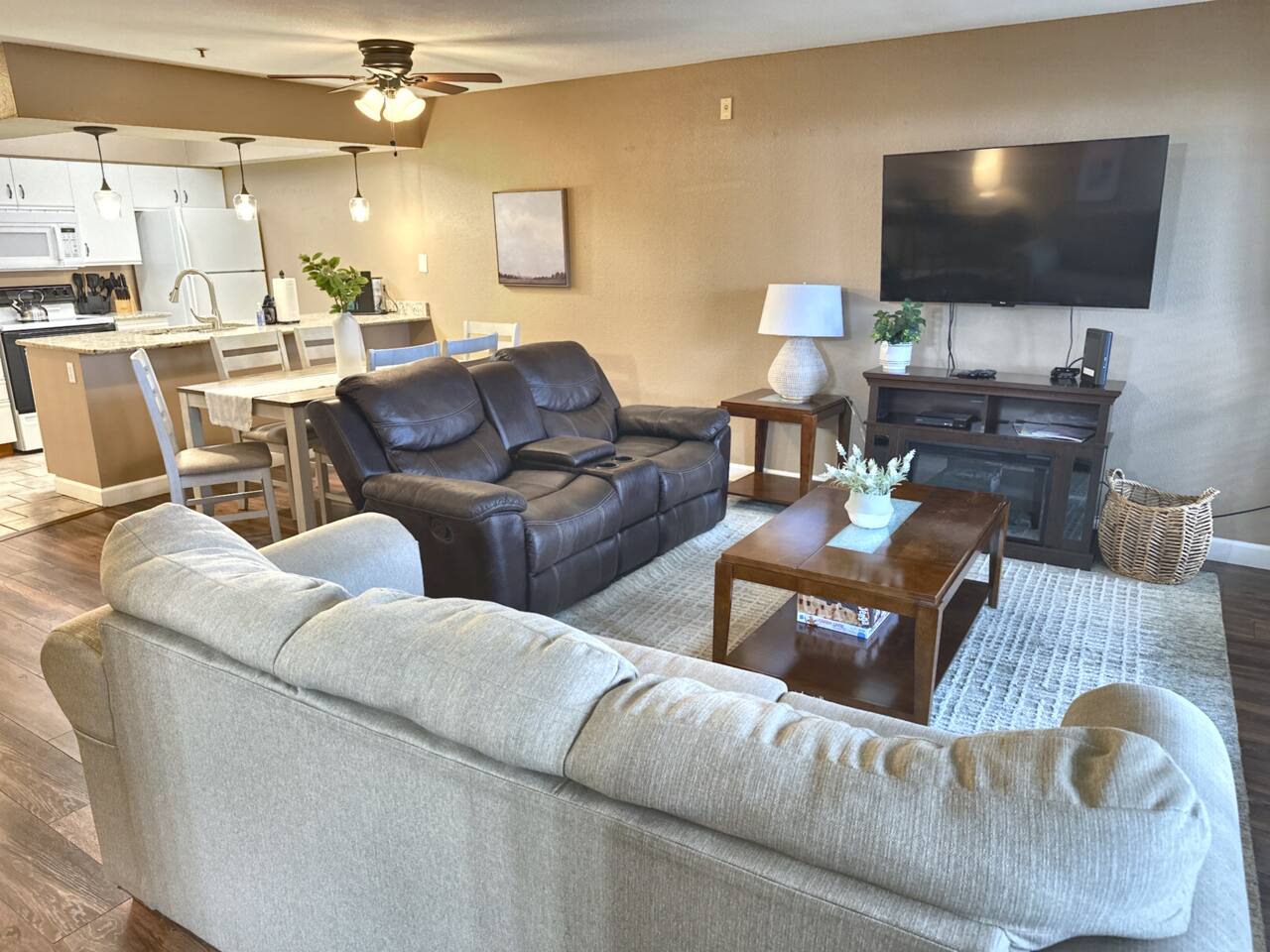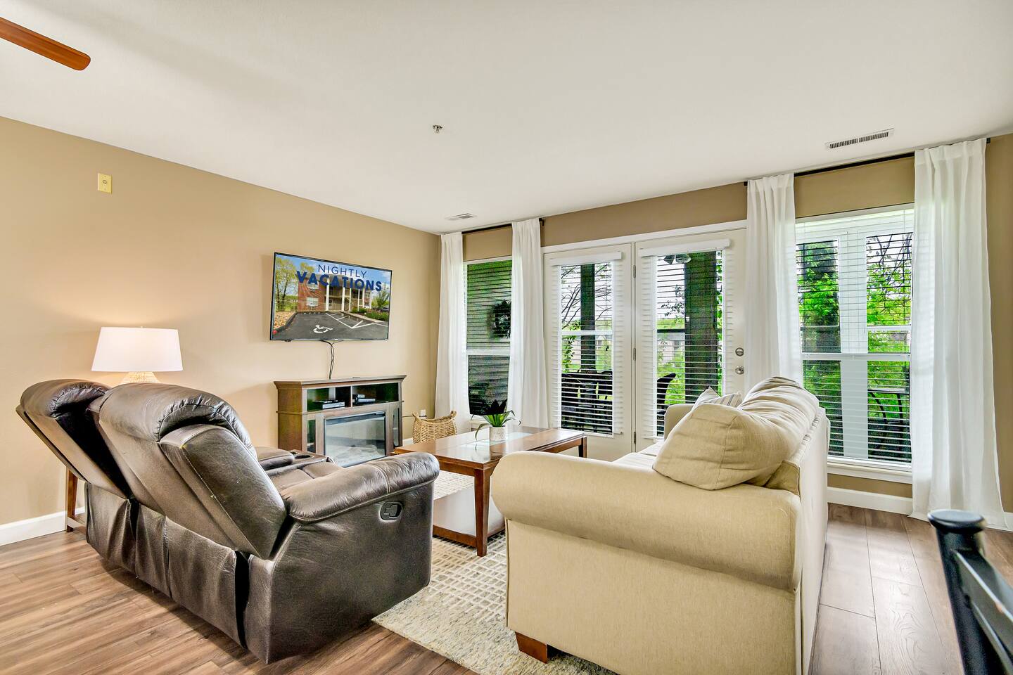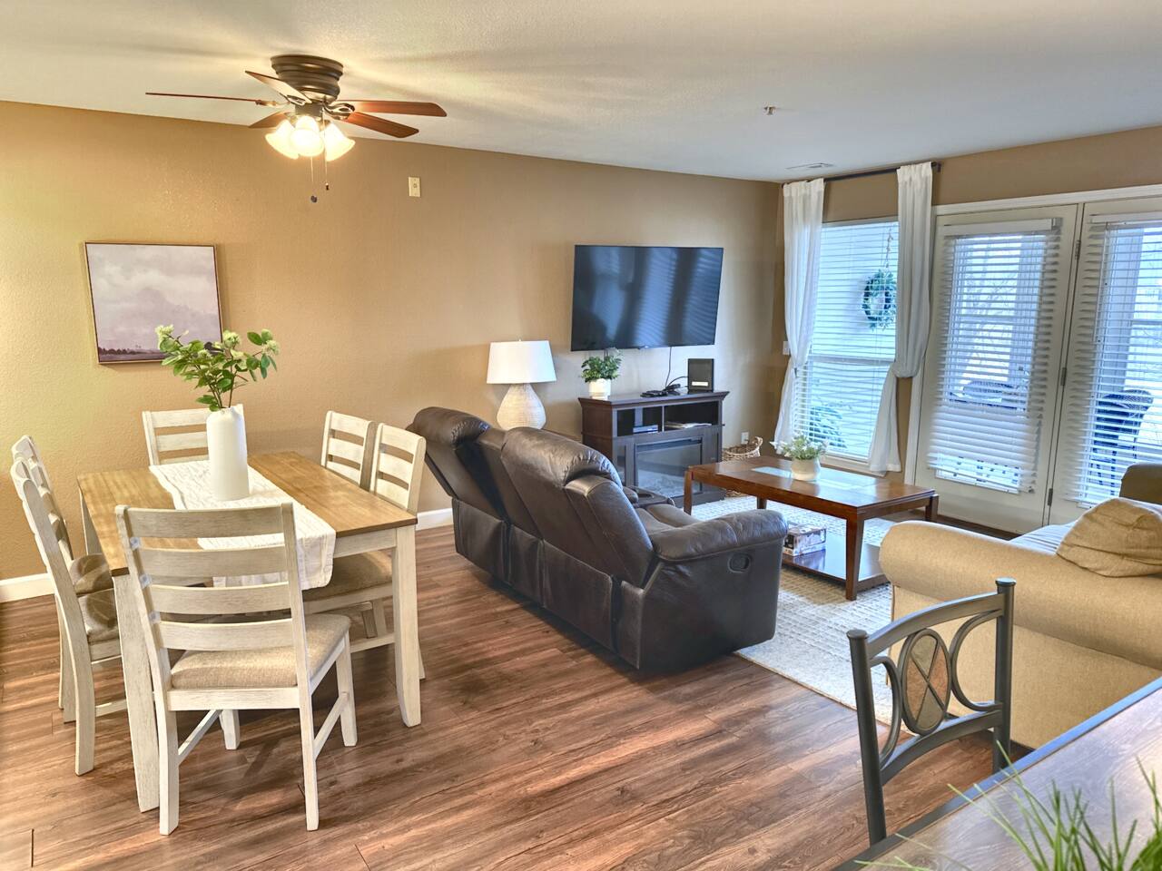 🛌 Comfortable Sleeping Arrangements Bedroom 1 • Two comfortable Queen beds — perfect for kids or friends traveling together Bedroom 2 • Private King bedroom for restful nights Bathrooms • Two full bathrooms so everyone can get ready easily Sleeps up to 6 guests comfortably ☀️ Bright Sunroom One of the best features of the condo is the beautiful climate-controlled sunroom. This relaxing space is perfect for: • Morning coffee • Reading a book • Evening wine after a day exploring Branson Large windows bring in natural light and views of the surrounding greenery. 🍳 Fully Equipped Kitchen The kitchen has everything you need to cook during your stay: • Coffee maker • Keurig • Blender • Crockpot • Wine glasses • Cookware and baking supplies 🛋 Comfortable Living Room Relax on the comfortable reclining sofa and enjoy: • Smart TV • Fast Wi-Fi • Board games and family time The open layout makes it easy for everyone to spend time together. 📍 Prime Branson Location Located inside Thousand Hills Golf Resort, you are just minutes from Branson's best attractions. 3 minutes → Branson 76 Strip 10 minutes → Table Rock Lake 12 minutes → Silver Dollar City 5 minutes → Branson Landing shopping & restaurants Nearby attractions include: • Titanic Museum • WonderWorks • Aquarium at the Boardwalk • Live music shows • Mini golf and go-karts 🏊 Resort Amenities Guests also enjoy access to: • Outdoor pool located next door to the building (seasonal) • Beautiful Thousand Hills Golf Course • Quiet resort atmosphere 👍 Why Guests Love This Condo • Spacious layout for families and groups • Bright relaxing sunroom • Pool next door • Minutes from the Strip • Comfortable beds • Fully equipped kitchen Guest Access Guests have full access to the entire condo including: • Living room • Kitchen • Sunroom • Washer and dryer • Pool access next door Entry requires one flight of stairs down to the front door. From Memorial Day to Labor Day, guests can park by the pool and walk through for step-free access.