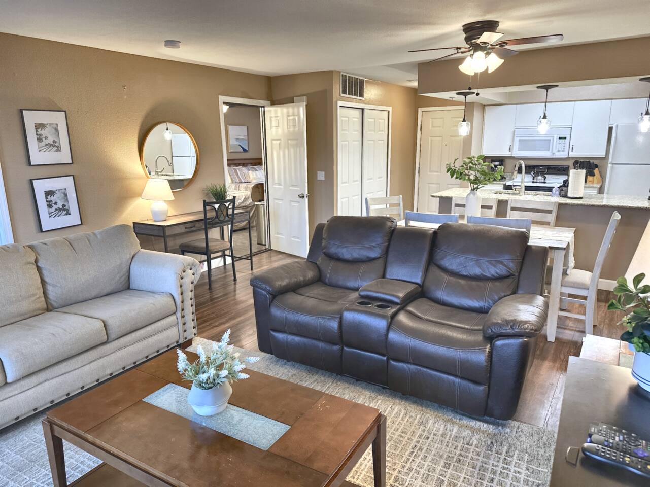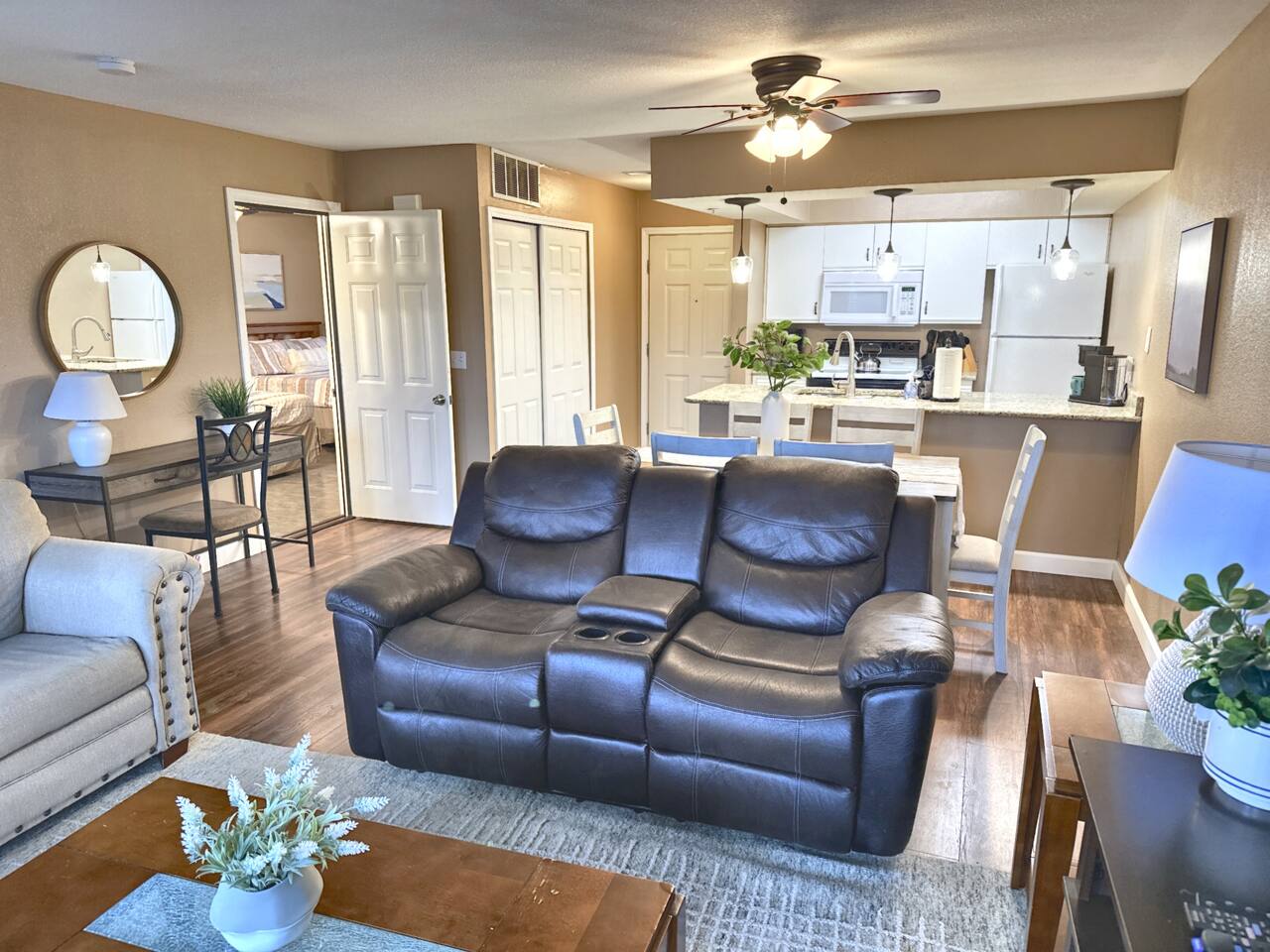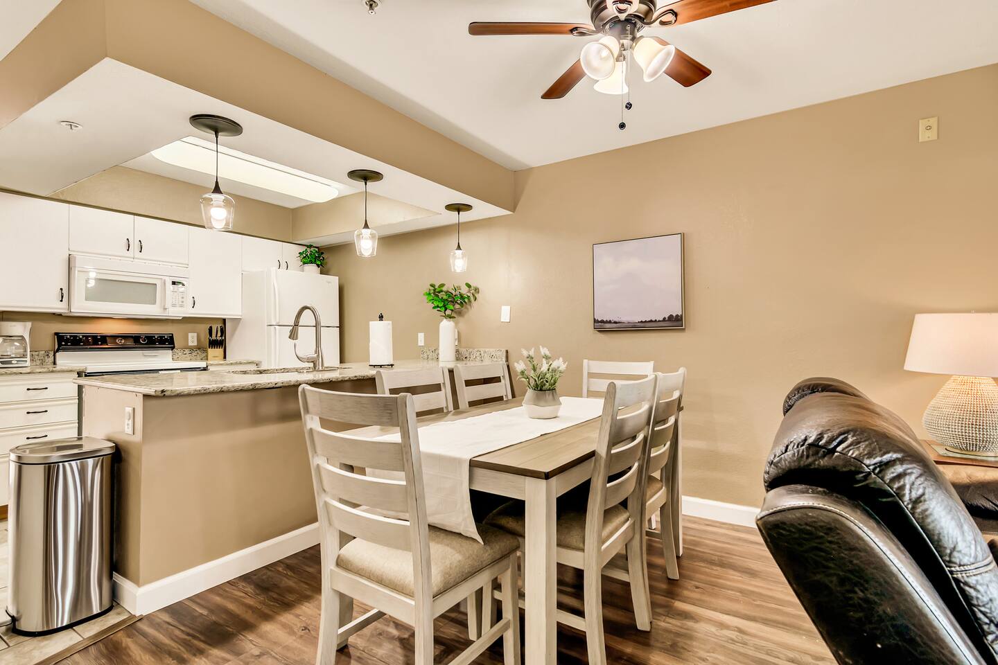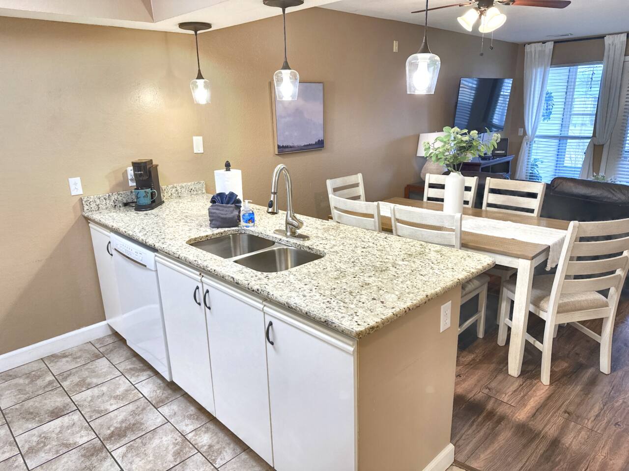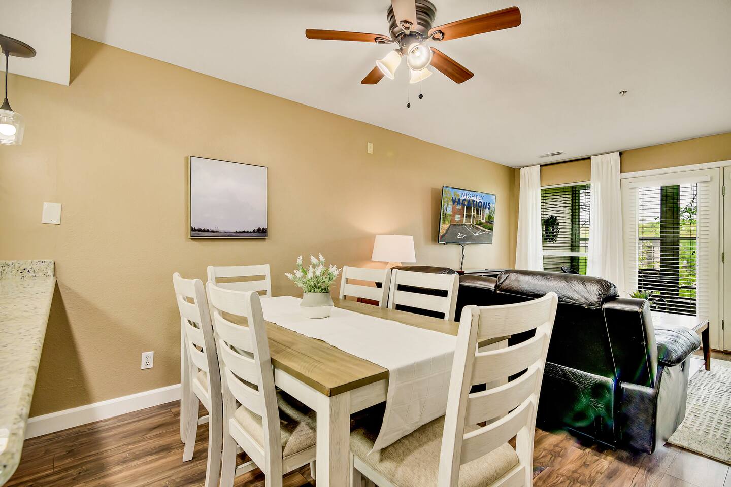 🛌 Comfortable Sleeping Arrangements Bedroom 1 • Two comfortable Queen beds — perfect for kids or friends traveling together Bedroom 2 • Private King bedroom for restful nights Bathrooms • Two full bathrooms so everyone can get ready easily Sleeps up to 6 guests comfortably ☀️ Bright Sunroom One of the best features of the condo is the beautiful climate-controlled sunroom. This relaxing space is perfect for: • Morning coffee • Reading a book • Evening wine after a day exploring Branson Large windows bring in natural light and views of the surrounding greenery. 🍳 Fully Equipped Kitchen The kitchen has everything you need to cook during your stay: • Coffee maker • Keurig • Blender • Crockpot • Wine glasses • Cookware and baking supplies 🛋 Comfortable Living Room Relax on the comfortable reclining sofa and enjoy: • Smart TV • Fast Wi-Fi • Board games and family time The open layout makes it easy for everyone to spend time together. 📍 Prime Branson Location Located inside Thousand Hills Golf Resort, you are just minutes from Branson's best attractions. 3 minutes → Branson 76 Strip 10 minutes → Table Rock Lake 12 minutes → Silver Dollar City 5 minutes → Branson Landing shopping & restaurants Nearby attractions include: • Titanic Museum • WonderWorks • Aquarium at the Boardwalk • Live music shows • Mini golf and go-karts 🏊 Resort Amenities Guests also enjoy access to: • Outdoor pool located next door to the building (seasonal) • Beautiful Thousand Hills Golf Course • Quiet resort atmosphere 👍 Why Guests Love This Condo • Spacious layout for families and groups • Bright relaxing sunroom • Pool next door • Minutes from the Strip • Comfortable beds • Fully equipped kitchen Guest Access Guests have full access to the entire condo including: • Living room • Kitchen • Sunroom • Washer and dryer • Pool access next door Entry requires one flight of stairs down to the front door. From Memorial Day to Labor Day, guests can park by the pool and walk through for step-free access.