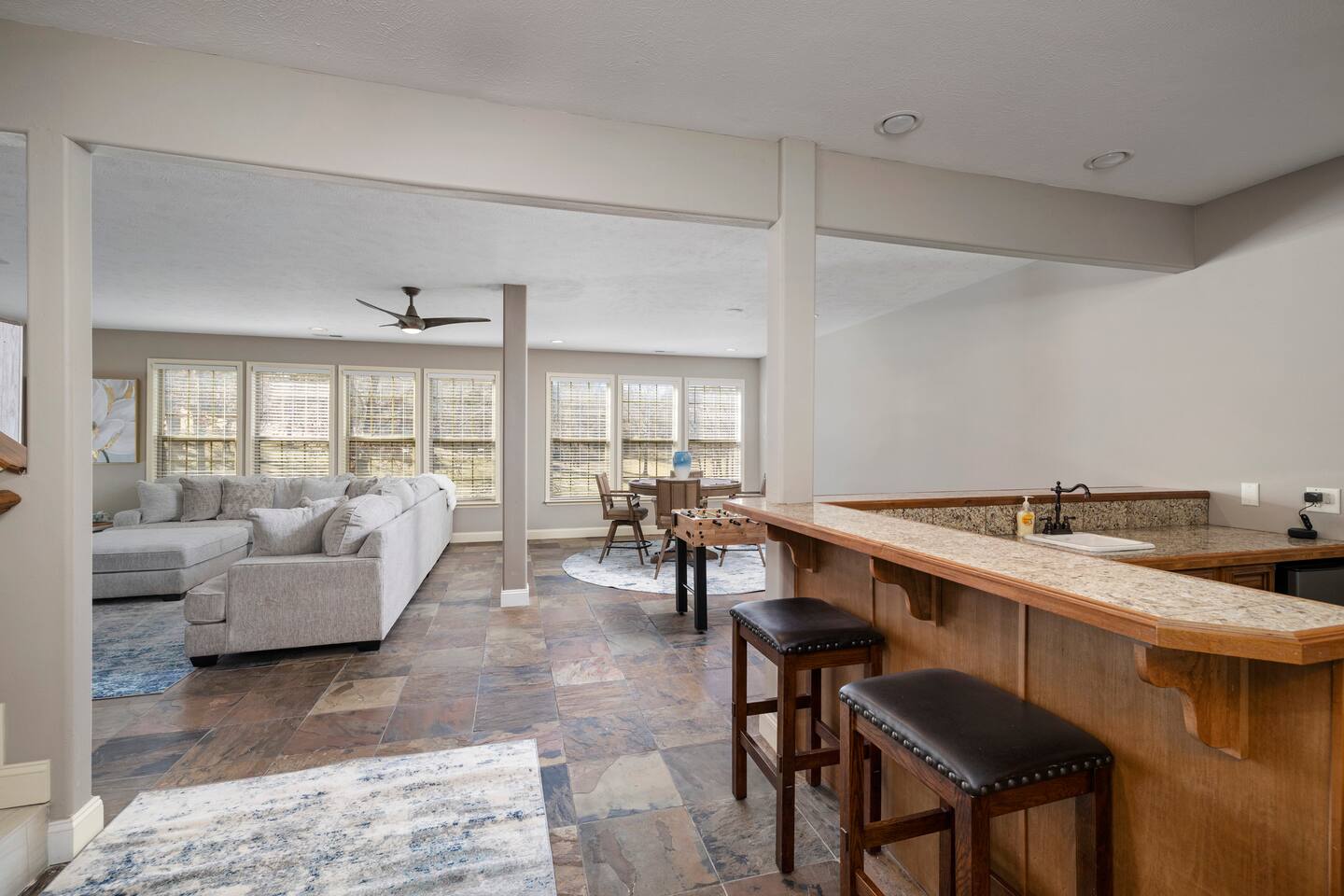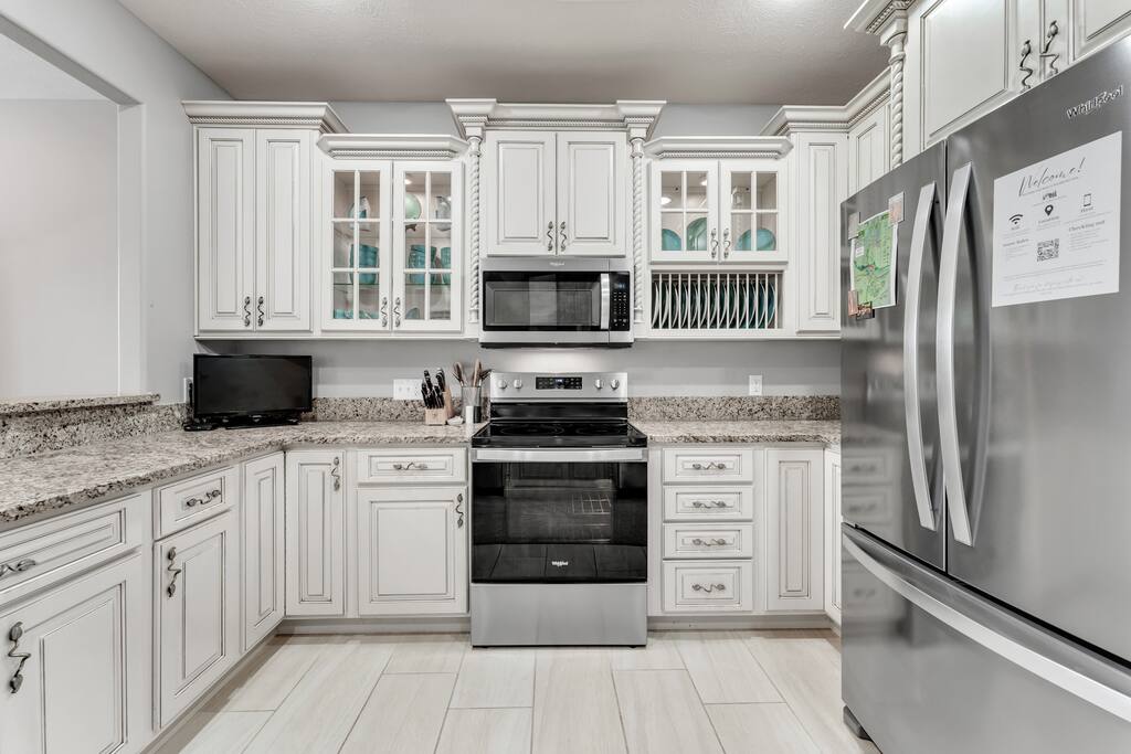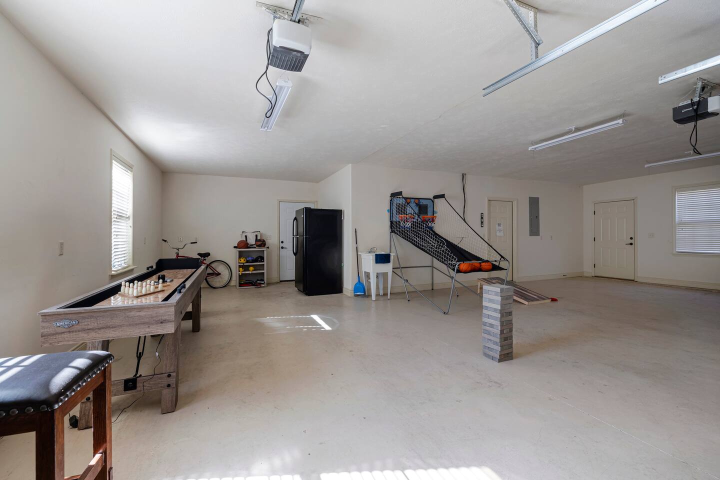 Sit back and relax in serenity when you rent this impeccable 4 bedroom 3 level vacation rental in picturesque Stonebridge Resort! Feel like royal company as you step into the front door of this residence and find everything you need for your perfectly posh vacation right at your fingertips. Mix up a meal fit for a king in the fantastic full-sized kitchen, or take a seat in one of two living areas. Take the time to stretch out and catch up on all your favorite shows on the huge flat screen TVs. And when you're ready to sit and plan all the fun activities you have ahead during your stay, take a moment and step out on the backyard patio or the screened balcony to let the fresh breeze stir your vacation imagination! This majestic base in the perfect place to return to after a long, fun-filled day in the Ozarks. No need to worry about dirtied clothes, it's just as easy as tossing them in your own private washer-dryer unit. Tension can really put a sore spot on a vacation, but it will melt away with ease after a quick dip in the elegantly designed master bathtub, complete with water jets. A perfect day turns into a perfect night when you curl up next to the fireplace and share all your memories of the day with your loved ones and the night rolls by. You may never want to leave once you see the game set up in the large three car garage. We have cornhole, darts, shuffleboard, basketball Pop a Shot, giant Jenga and a wall mounted Connect Four game.