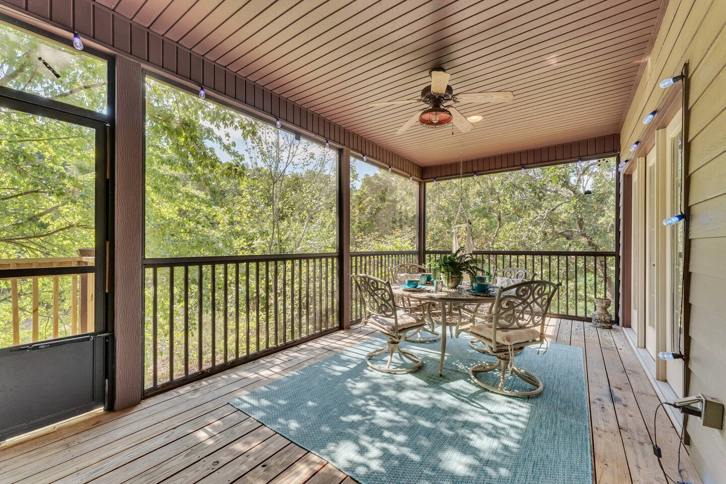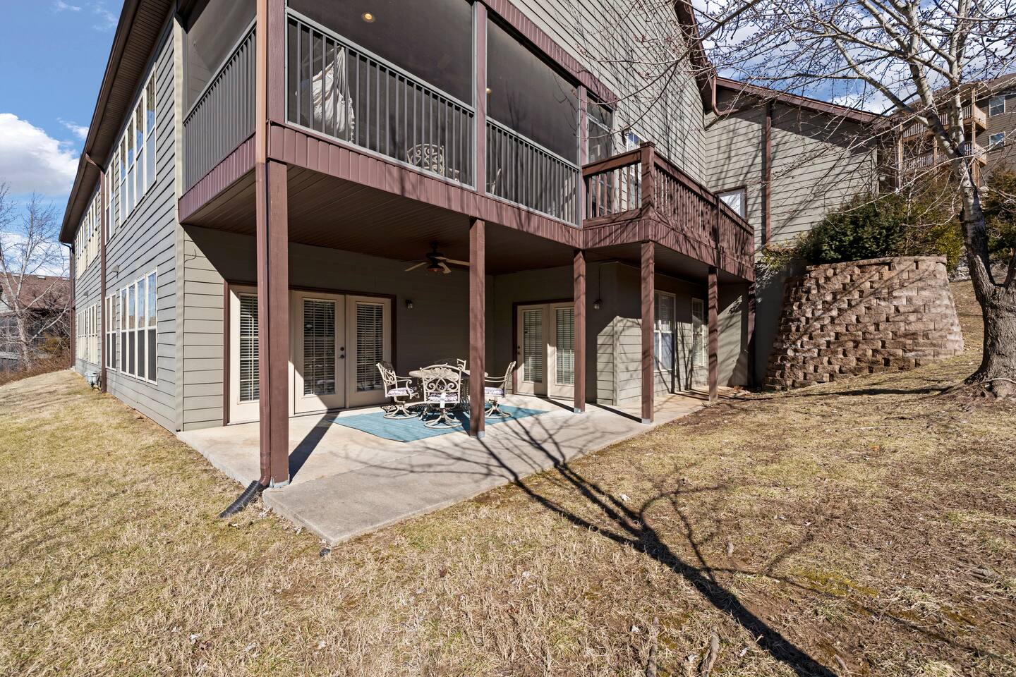 Luxury, high end home overlooking the 13th green of Ledgestone golf course in the gated community of Stonebridge. This is just a stone's throw away from Silver Dollar City! Stonebridge resort amenities are second to none. We have everything you need to make your Branson vacation a memory of a lifetime. Three swimming pools, 3 tennis and pickleball courts, onsite restaurant-LedgeStone Grille, 3 playgrounds, sand volleyball, basketball court, paved walking path, lake with fountain, banquet facilities, 24 hour gated security. We even have our own well stocked, catch and release lake! What could be more fun than letting the kids, or the kid in all of us, enjoy the thrill of landing a fish. The home has upgraded fixtures, plumbing fixtures and granite countertops everywhere. Designer furniture with amazing luxury bedding & decor. Fully stocked, beautiful chef's kitchen makes having meals at home super easy. Beautiful dining room & living room on main floor both look out over the golf course. The sofa has a queen pull out sofa that sleeps two. Master suite with king bed (sleeps 2) on main level opens onto the deck that overlooks the 13th green. Extra large master bath has his/her vanities, jacuzzi tub and super spacious shower. Extra large master closet has more than enough room to store all of your belongings. Bedroom upstairs has a queen bed (sleeps 2) and a full large bathroom with large vanity area. Two bedrooms downstairs, one with a twin bunkbed and queen bed (sleeps 4), one with a king bed (sleeps 2). A queen self inflating air mattresses can be set up anywhere (sleeps 2). The downstairs family room area has a bar area, large, comfortable sectional, Huge TV, and game/poker table and foosball. The cutest kids hideaway space you've ever seen is downstairs under the staircase. Main level screened in porch with electric grill, table & chairs. Lower level patio is also great for sitting out and watching the golfers or just enjoying nature.