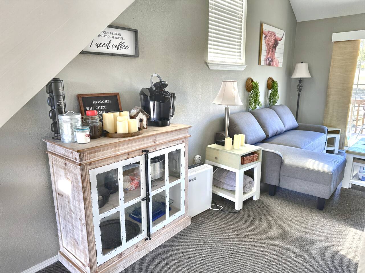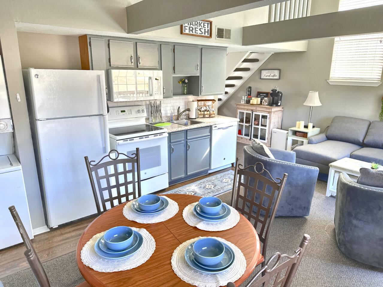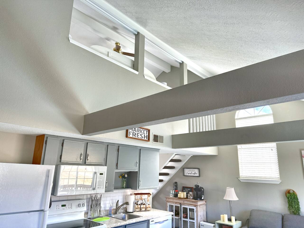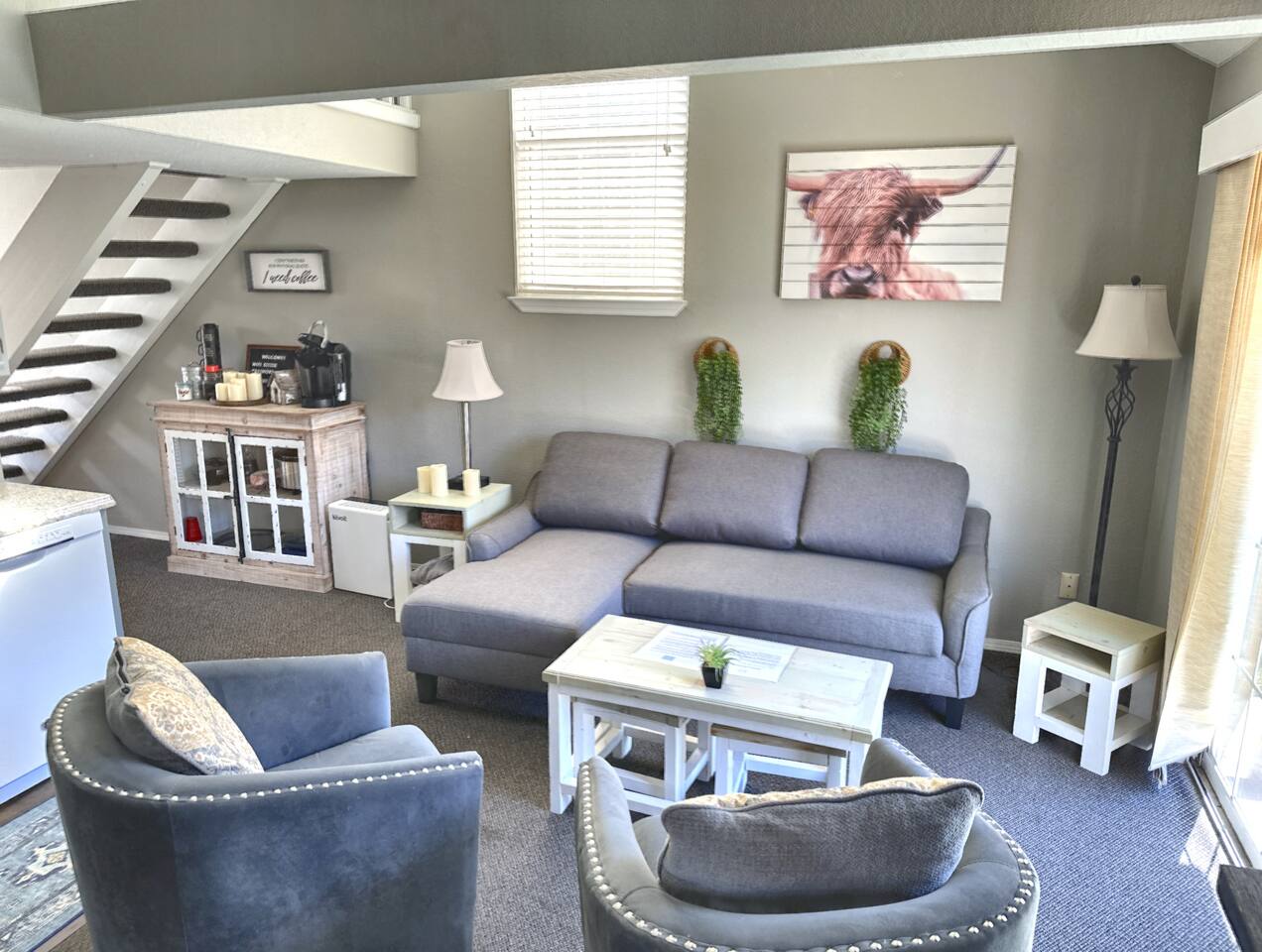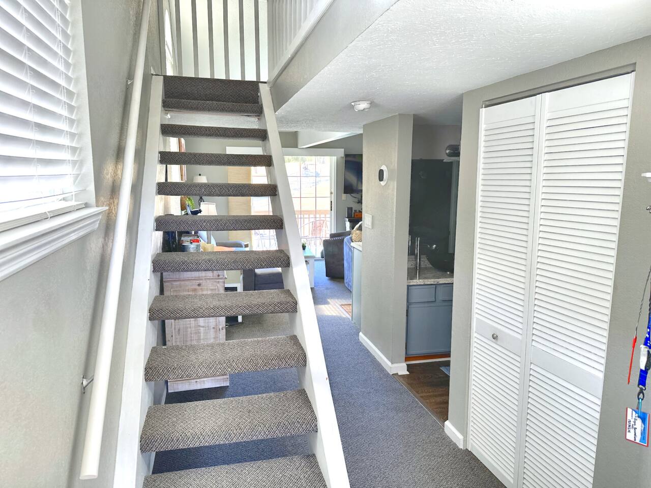 There are stairs to this condo. This home has a standard hot water heater and you will need to account for that much like in your own home. If you run out of hot water, please wait 45 minutes for the hot water to produce a full tank of hot water and then proceed with showers etc.
