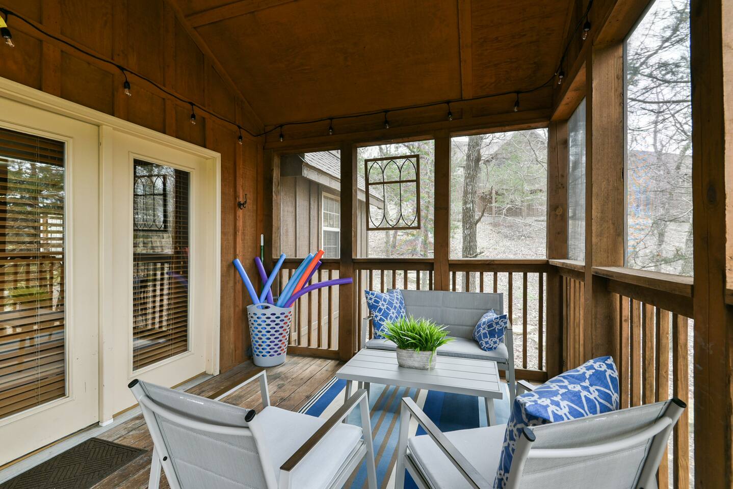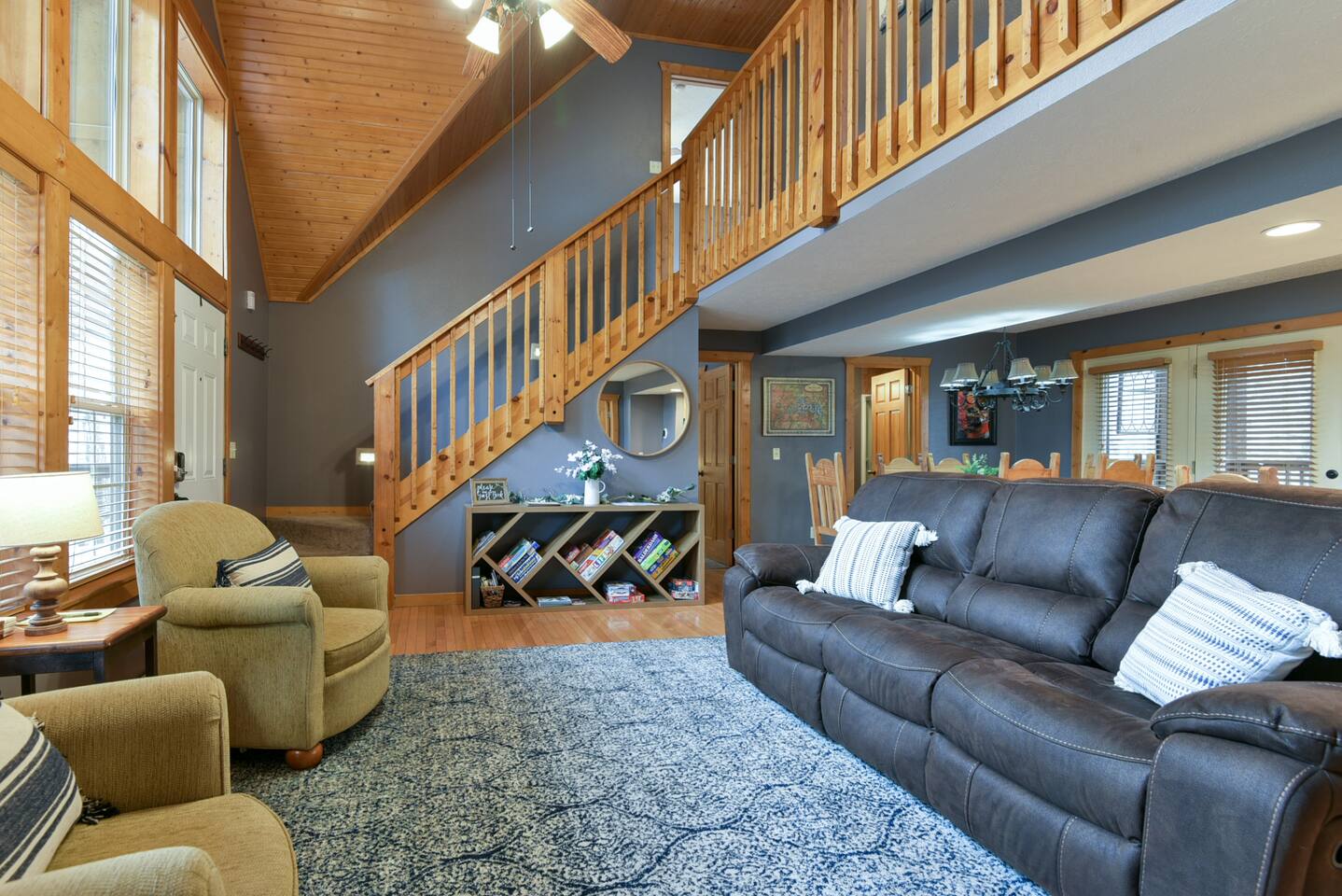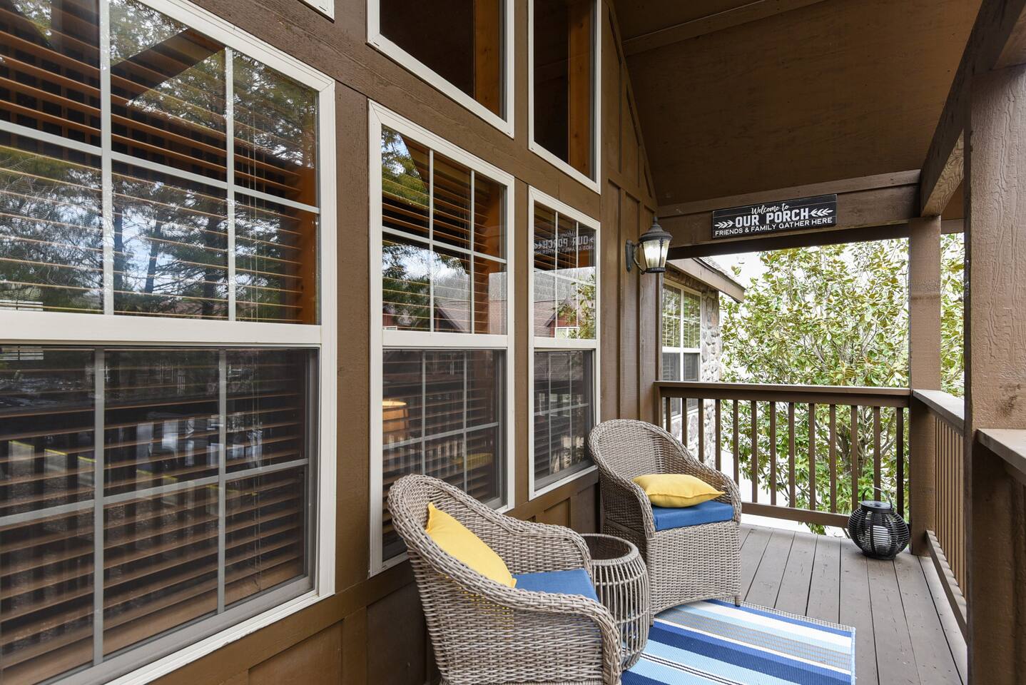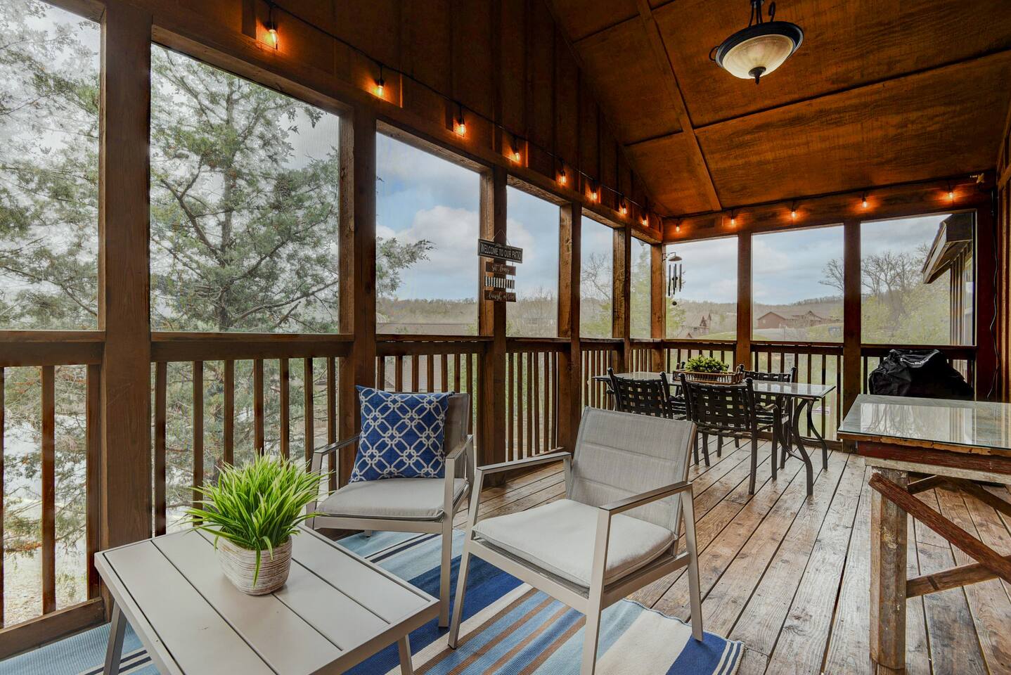 Enjoy the serenity of nature in this beautiful and spacious lodge in the heart of StoneBridge Village in Branson. Experience the best of both worlds - close to Branson, yet in a secluded and gated neighborhood. You will have access to the LedgeStone Golf Course, 3 outdoor pools, playgrounds, sand volleyball, basketball, tennis, and more. This lodge is only a short walk (2-3 minutes) to the Fox Hollow Lake and family-friendly pool with an easy walk-in slope, covered dining areas, basketball, volleyball court, and playground. You will also find a fabulous catch and release lake and walking trail next to the pool and within sight of this cabin. Enjoy the stone fireplace for a cozy evening in, the well-appointed kitchen for preparing meals after a busy day of golf or fun at nearby Silver Dollar City, and sleep well at night in the comfortable king beds. The lodge has free high speed wi-fi and cable tv in each bedroom. The screened and heated patio will be a hit for the whole family and is a great place to have a meal, enjoy that early morning cup of coffee while you watch the wildlife. Wildlife not your game? Catch the action on the 50” streaming tv! The kitchen is well stocked with all of the essentials and extras you would enjoy at home. A drip coffee pot, coffee bean grinder and a Keurig with enough coffee to get your trip started are all provided. There are beautiful views of the trees and changing seasons from the porch and lodge. We also provide an electric grill for your use and there are charcoal grills available throughout the StoneBridge property. We have worked hard to provide everything you need to make your Branson vacation perfect. All new (March 2022) bedding, towels, and linens are provided. There is so much to do while on property - three outdoor swimming pools (open Memorial Day through Labor Day), 3 tennis courts, onsite restaurant-LedgeStone Grille, 3 playgrounds, sand volleyball, basketball court, paved walking path, a lake with fountain, banquet facilities, 24 hours gated security, and a stocked, catch and release lake! We are located about 5 minutes from the famous Branson Strip so that you have quick and easy access to all of the shows, family entertainment (The Track go-karts, mini-golf, Titanic, Wonderworks, Ripleys, and so much more!), outlet mall and restaurants. We are three miles from Moonshine Beach, where you can play on a sandy beach next to Table Rock Lake. State Park Marina and Indian Point Marina are only 5 miles away - launch your boat or rent one and enjoy our beautiful lake. We allow up to two dogs under 40lbs - there is an additional $75 pet cleaning fee per stay. This is a NON SMOKING unit. We do not allow smoking in the home or on the porches. *The Stonebridge Village Welcome center charges a $5 per vehicle, per night resort fee. This fee is payable directly to the Stonebridge Village Welcome Center at the time of entry.