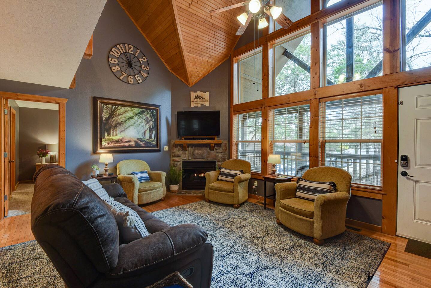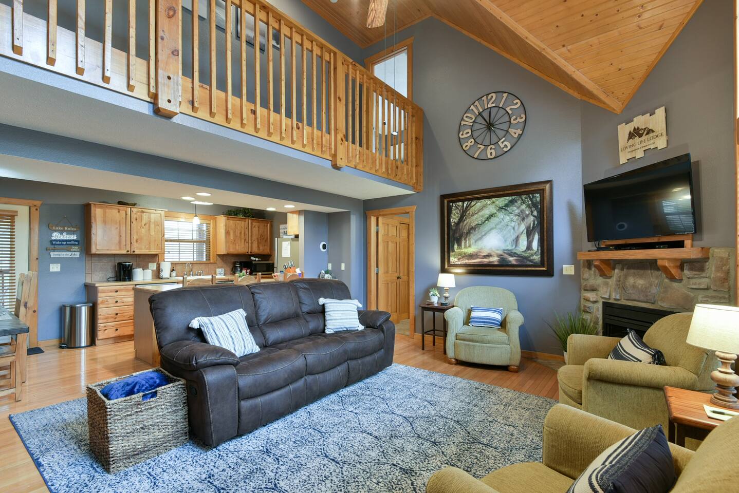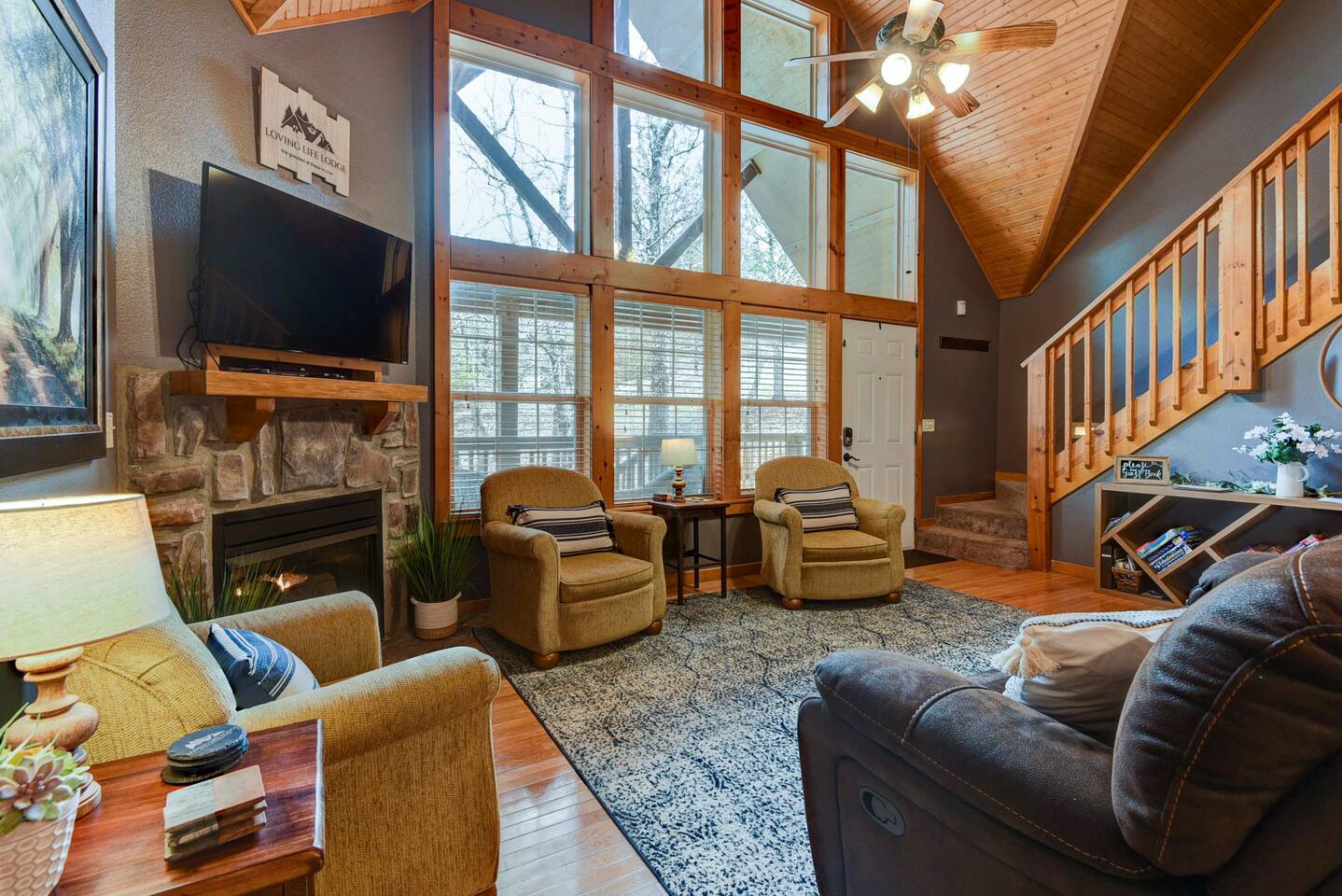 Come and enjoy Loving Life Lodge – your personal retreat in beautiful Branson, Missouri. This cabin is in the scenic Ozark hills right in the fabulous resort community of Stonebridge, home to the Ledgestone Golf Course and many wonderful amenities. With 4 full bedrooms, each with its own large bathroom complete with shower and jetted tub you will have room to spread out and enjoy your vacation. Socials: @Branson_rentals Branson Lakes Lodging