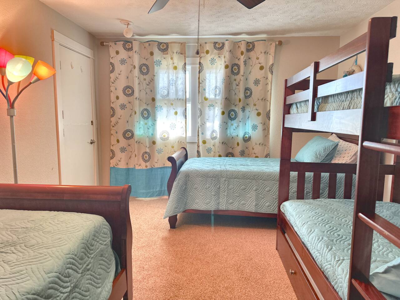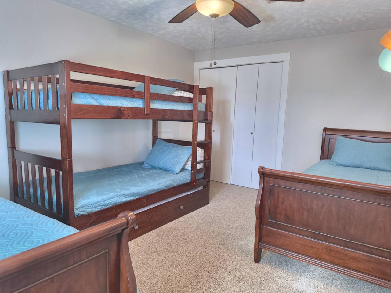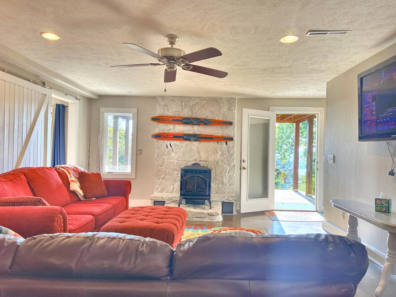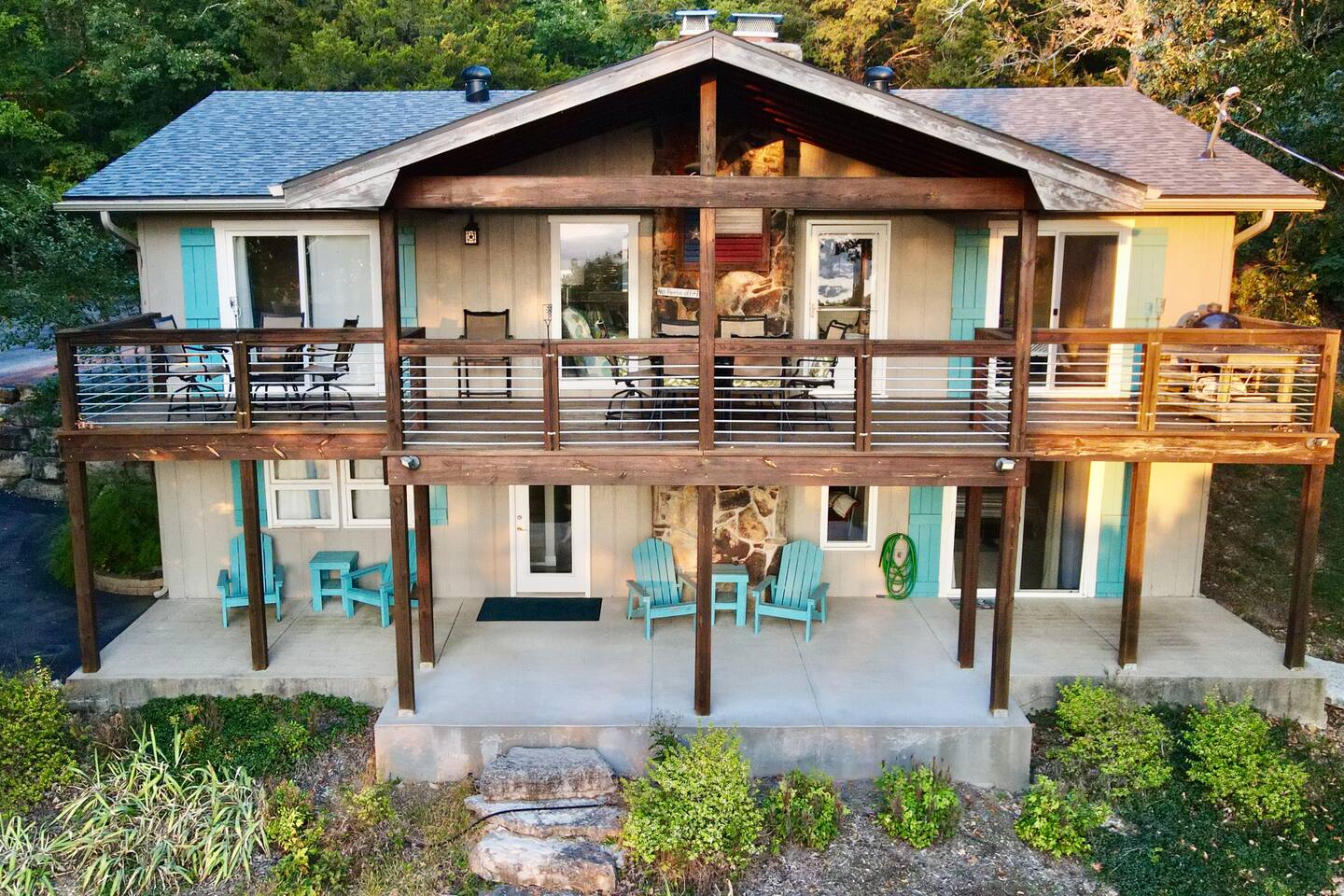 A Family Oasis: Imagine a place where you and your loved ones can come together, where laughter fills the air, and where memories are made that will be cherished for a lifetime. This vacation rental is your oasis of togetherness, inviting you to reunite with family and friends in a spacious and welcoming atmosphere. ** Property has 4 total private bedrooms and a bonus area off of the lower level living room. 3 of the private bedrooms each have a King size bed, the lower level living room has has two additional Queen beds and the private bunk room has 4 twin beds and a twin trundle bed for total of 5 twin beds.** Scenic Bliss: Step onto the back deck and let your breath be taken away by the awe-inspiring views of the Ozark Mountains and the tranquil waters of Table Rock Lake. As you sip your morning coffee or share a toast under the starlit sky, you'll feel an overwhelming sense of peace and serenity wash over you. Nature's Playground: Venture into the great outdoors from the comfort of your own yard. Observe the gentle wildlife that graces the peaceful surroundings. Whether you're an avid birder or simply appreciate the wonders of nature, this retreat offers you a front-row seat to the beauty of the wild. Boater's Delight: Pack your bags and leave behind the ordinary because the adventures here are limitless. Plenty of parking awaits you, and there's even room for your boats, setting the stage for endless aquatic escapades. The home is only a short 10-minute drive from Kimberling City Marina, your gateway to Table Rock Lake, ensuring that your boating desires are easily fulfilled. And if you need more room, we have another house across the street available, ensuring that no one is left behind. Grill, Relax, and Savor: Fire up the built-in grill on the back deck or gather around the natural fire pit in the yard. Plentiful seating provides comfort for your entire group as you soak in the views and unwind after an exhilarating day on the lake. Proximity to Thrills: For those seeking thrills and excitement, just 20 minutes away lies Silver Dollar City, a realm of adventure and entertainment. Additionally, you'll find the Joe Bald Boat Ramp and day-use area just a quick 5-minute drive away, ready to launch your aquatic endeavors. A Home of Warmth and Comfort: This retreat boasts four bedrooms, two welcoming living areas, and an open sleeping area on the lower level, ensuring there's space for everyone. The main level offers breathtaking views and an abundance of seating, while the lower floor provides warmth with a beautiful pellet stove and cozy seating. Dining with a View: Gather around the spacious kitchen bar or dine al fresco on the stunning deck, where the lake and mountain views transform every meal into a feast for the senses. Your Every Need Anticipated: We pride ourselves on exceeding your expectations. Quality towels and linens, a well-stocked kitchen, and a living space designed for relaxation are all part of the experience. We anticipate your needs so that you can simply focus on creating cherished memories. Pet-Friendly Paradise: Your furry companions are welcome here, with space for up to two dogs per stay and a $75 pet fee. We kindly request that dogs be crated when left alone and refrain from using the furniture. Respectful and Tranquil: In this peaceful neighborhood, we prioritize respect for the home and community. Surveillance cameras protect the house and our guests, ensuring a safe and tranquil environment. Quiet hours between 10:00 PM and 8:00 AM are sacred, allowing for rejuvenating rest. Your Vacation Haven Awaits: Connect with us on social media: @branson_rentals. Book your stay at this unparalleled lake view retreat and set the stage for an unforgettable vacation filled with emotions, adventures, and a deep sense of relaxation. Your dream vacation begins here!