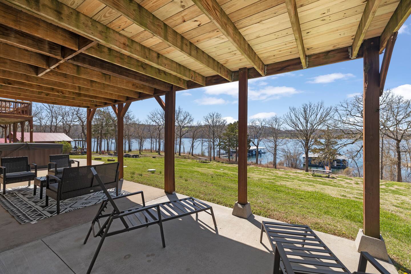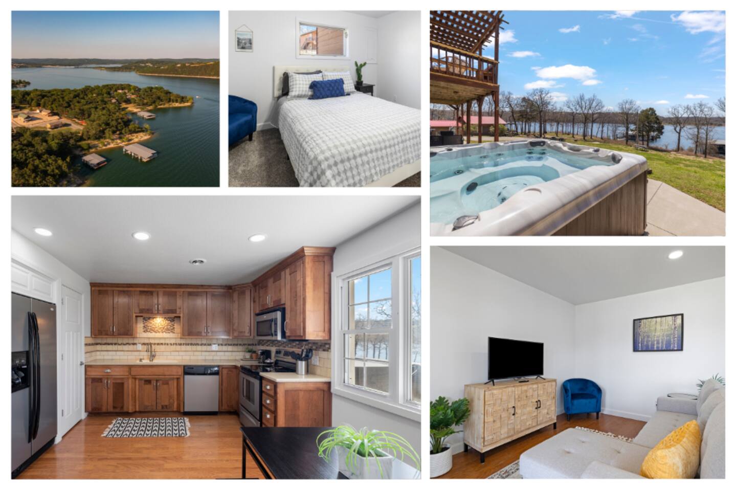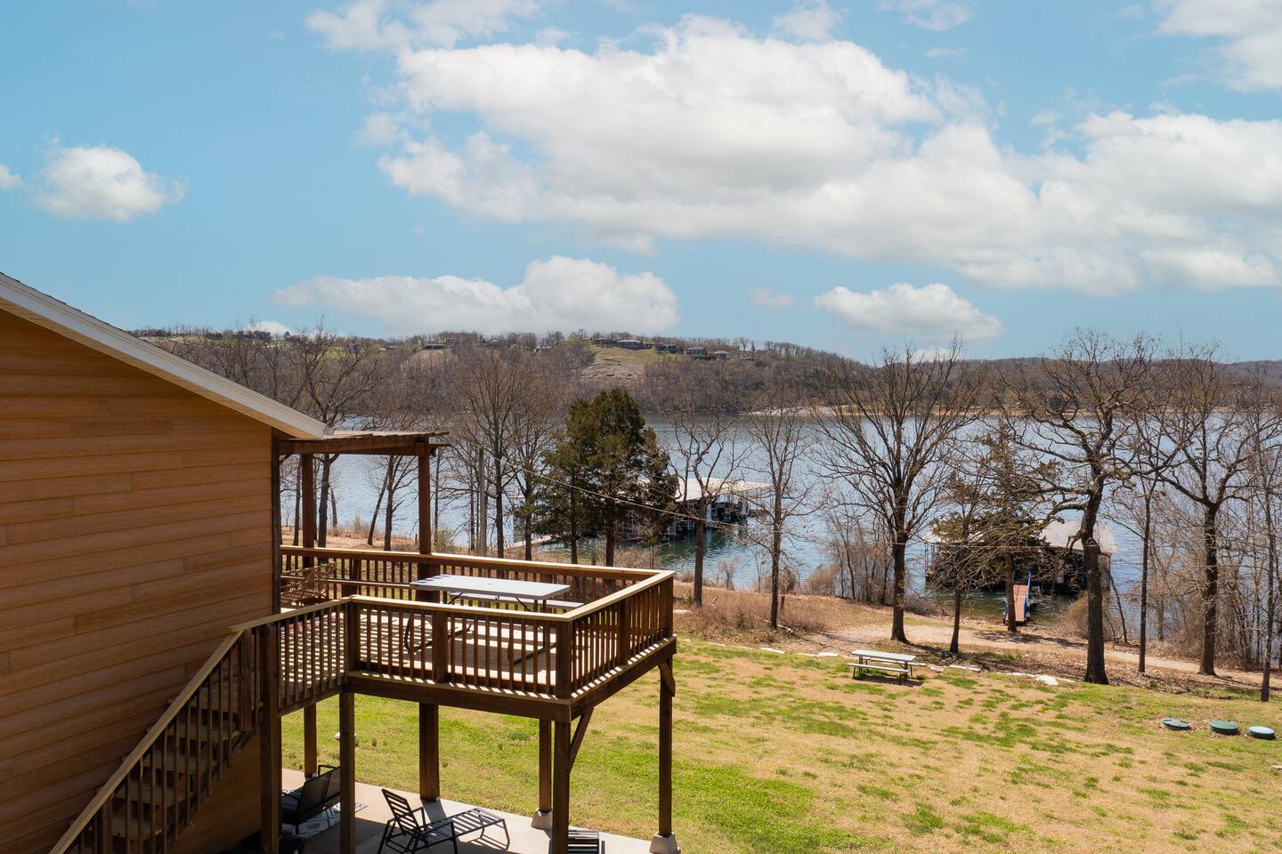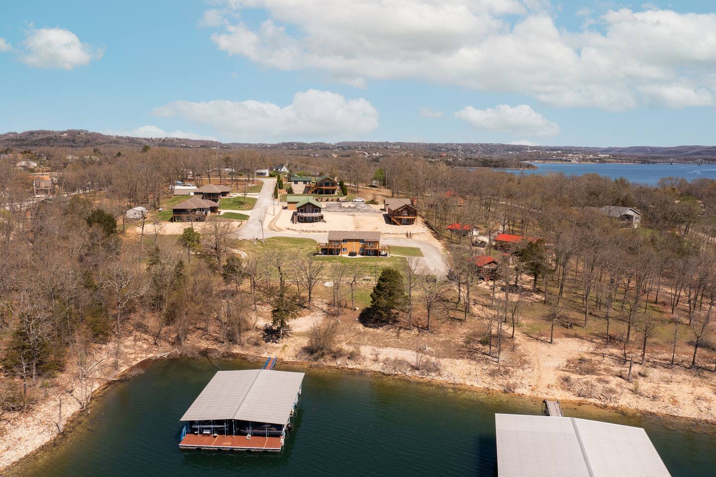 Fun and sun sparkling on the water. Our condo, situated on the bottom level of our two-story property, provides instant access to the lakeshore. Step outside and embrace the tranquility of Table Rock Lake. Need more space? All four units in this building are available. Just click on our hosting profile to see our other units. Convenient Boat Launch: Adventure awaits! Launch your boat just minute away at Joe Bald boat ramp and explore the scenic wonders of Table Rock Lake. Whether you're into fishing, water sports, or simply cruising, this location is a boater's dream. Breathtaking Views: Enjoy panoramic views that will take your breath away. The beauty of Table Rock Lake unfolds before you, creating a picturesque backdrop for your unforgettable stay. Spacious and Inviting: With 1,100 sq ft of living space, this condo offers comfort and style. Two full-sized bathrooms ensure convenience for your entire crew. No need to rush in the morning or wait in line for the shower – we've got you covered! Family-Friendly Retreat: This property is designed with families in mind. The cozy living room features a queen sleeper sofa, perfect for relaxing after a day of lake adventures. Bedroom 1 and Bedroom 2 both boast comfortable queen beds, providing a restful haven for a good night's sleep. Shared Hot Tub: After a day of lake activities, unwind in our 7-person shared hot tub (4 units share the hot tub). Soak away the stresses and enjoy the company of friends and family under the starlit sky – the perfect way to end your day. Most people go to the right of the docks and swim from the rocks. Because it’s an Army Corp lake the shoreline cannot be improved by owners and is natural. If you want a roped off swim area, you can visit Kimberling City Marina, which is just a few minutes away. Book now for a family-friendly, lakefront retreat that promises breathtaking views and endless memories!